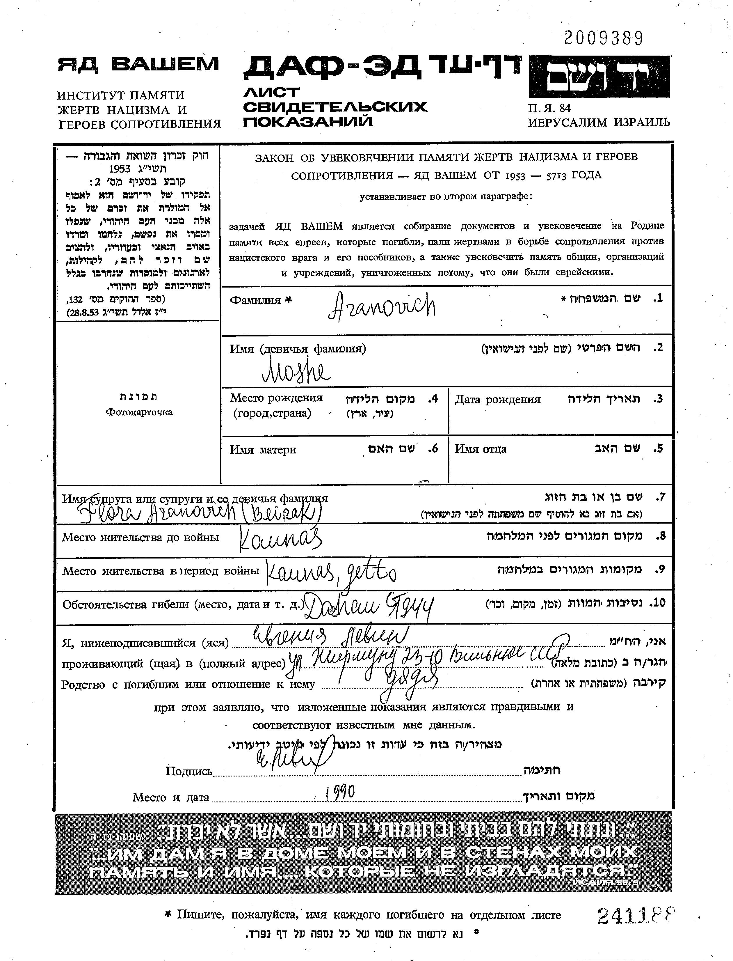 Aranovich Moshe Kaunas, Lituania Hoja de Testimonio