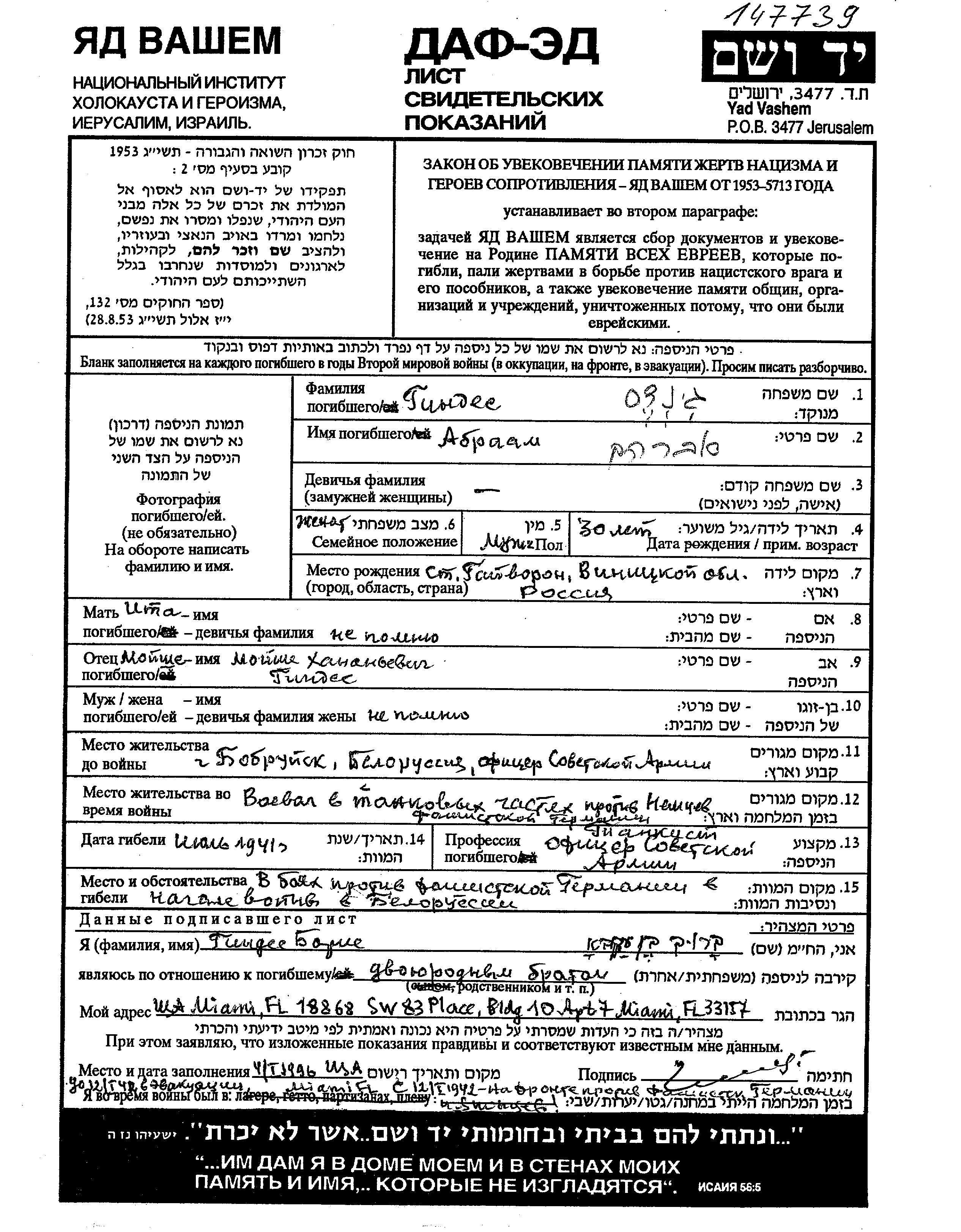 Avraam Gindes nació en Gayvoron, Ucrania (URSS) en 1911, hijo de Moishe y Ita. Era Oficial y Casado. Antes de la segunda guerra mundial vivía en Bobruysk, Bielorrusia (URSS). Durante la guerra estuvo en las fuerzas armadas soviéticas. Avraam murió en servicio militar. Lugar de la muerte: Bielorrusia (URSS) en 1941.