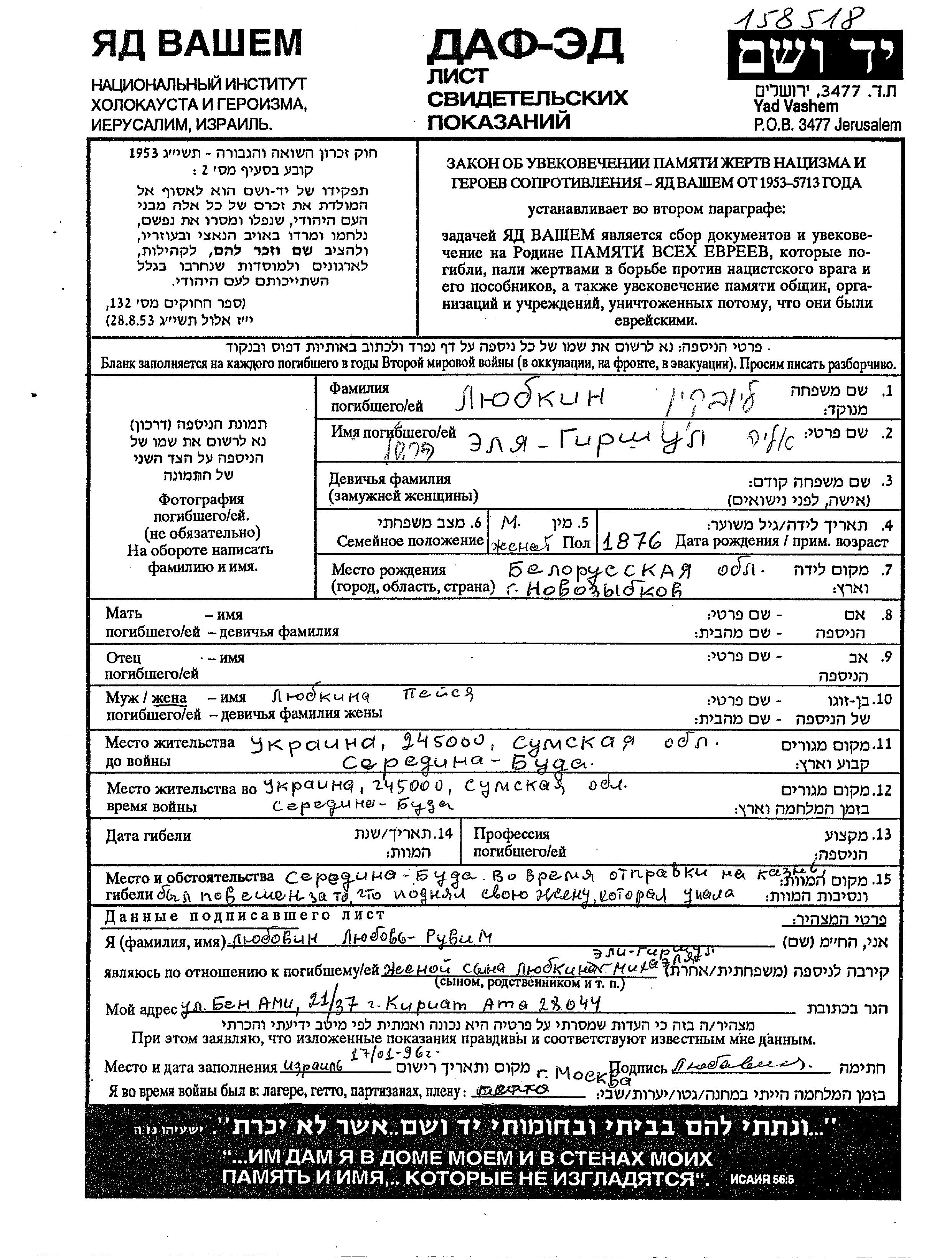 Lyubkin Elia Girshul Alia 1876 Seredina Buda, Ucrania (URSS) Hoja de Testimonio