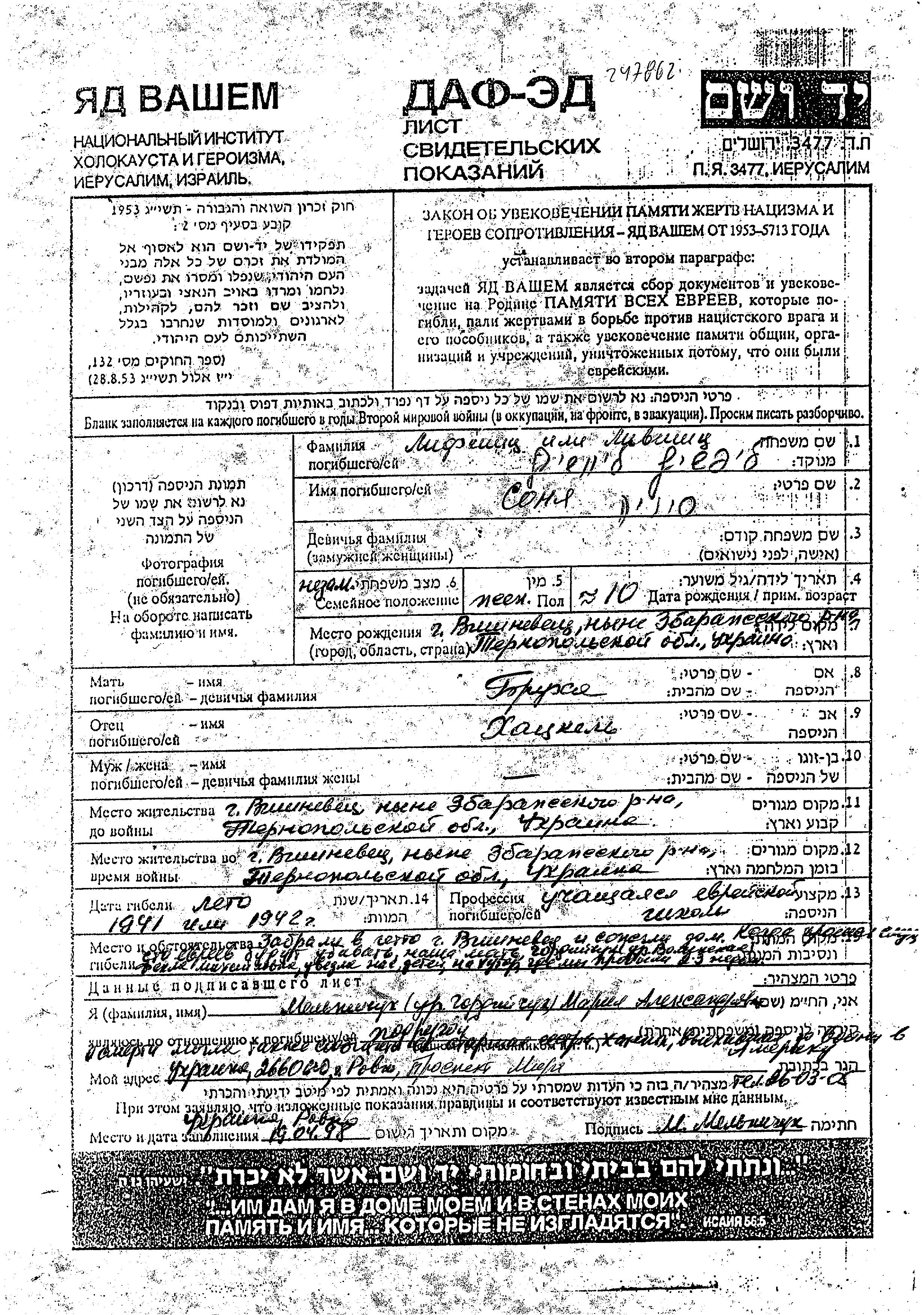 Livshitz Sonya 1931 Wisniowiec, Polonia Hoja de Testimonio