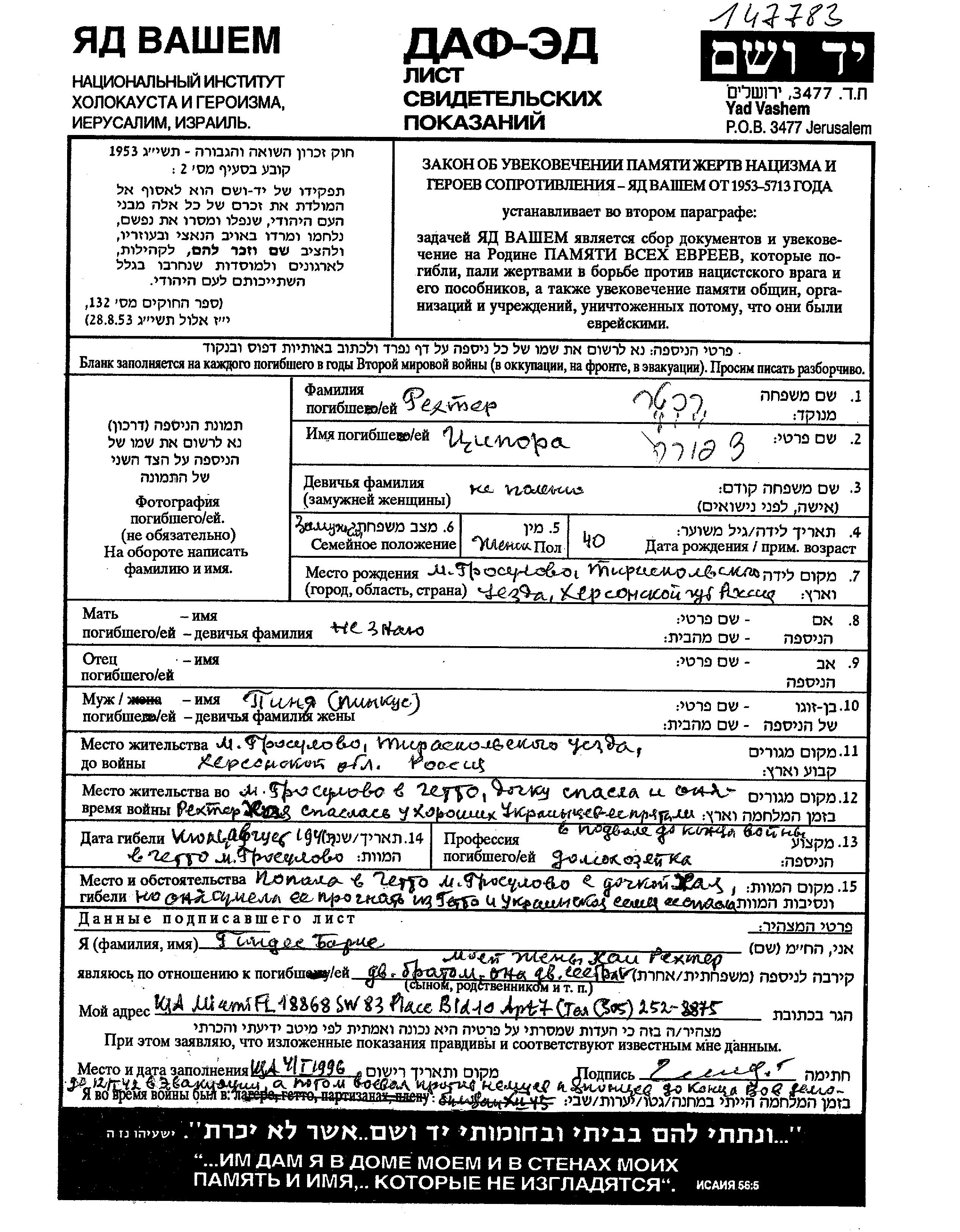 Rekhter Tzipora 1901 Grossulovo, Ucrania (URSS) Hoja de Testimonio