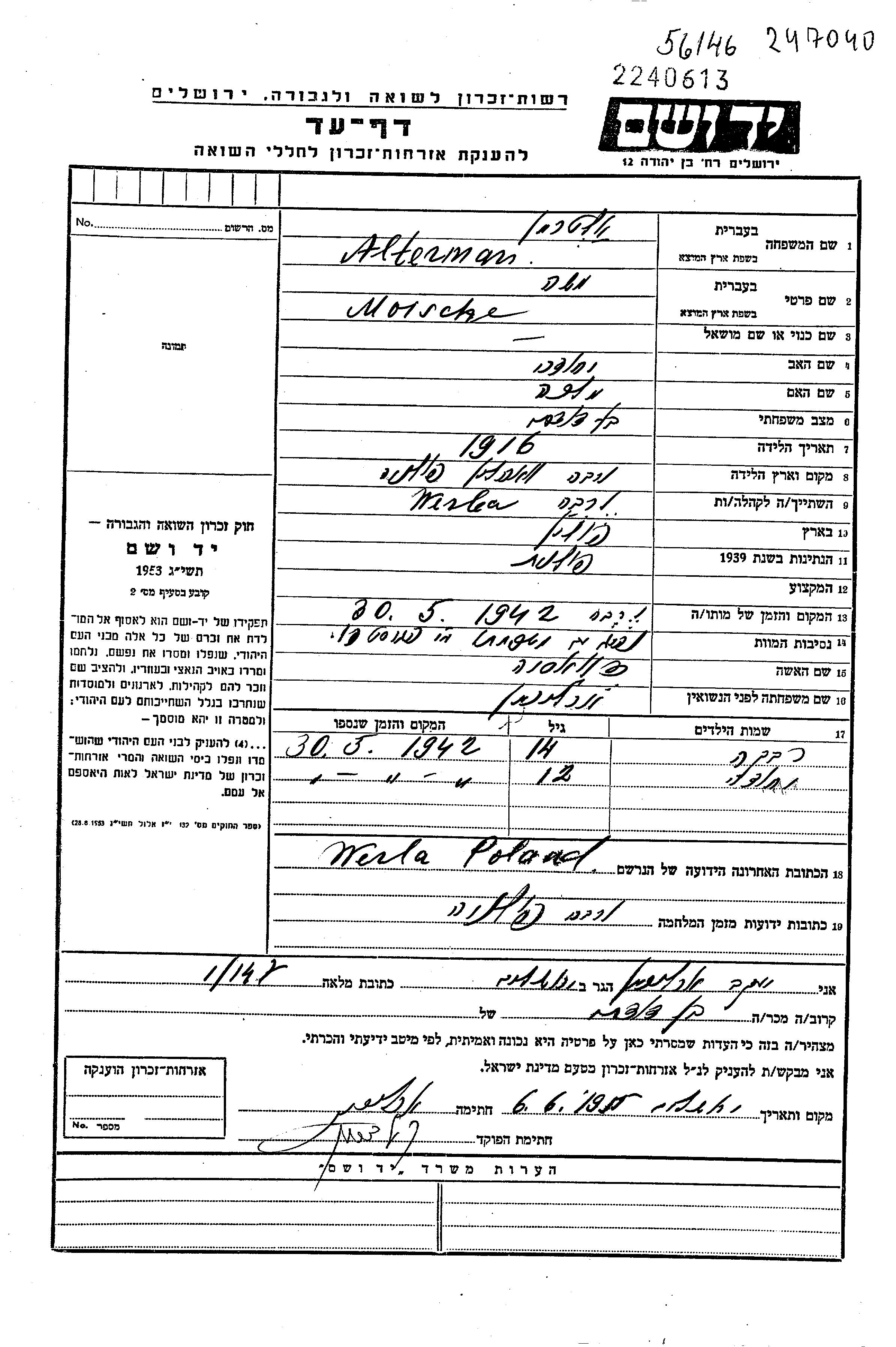 Moische Alterman nació en Warszawa, Polonia en 1916, hijo de Yehuda y Malka. Era Casado con Dvosia apellido de soltera Erlikhman. Antes de la segunda guerra mundial vivía en Werba, Polonia. Durante la guerra estuvo en Werba, Polonia.