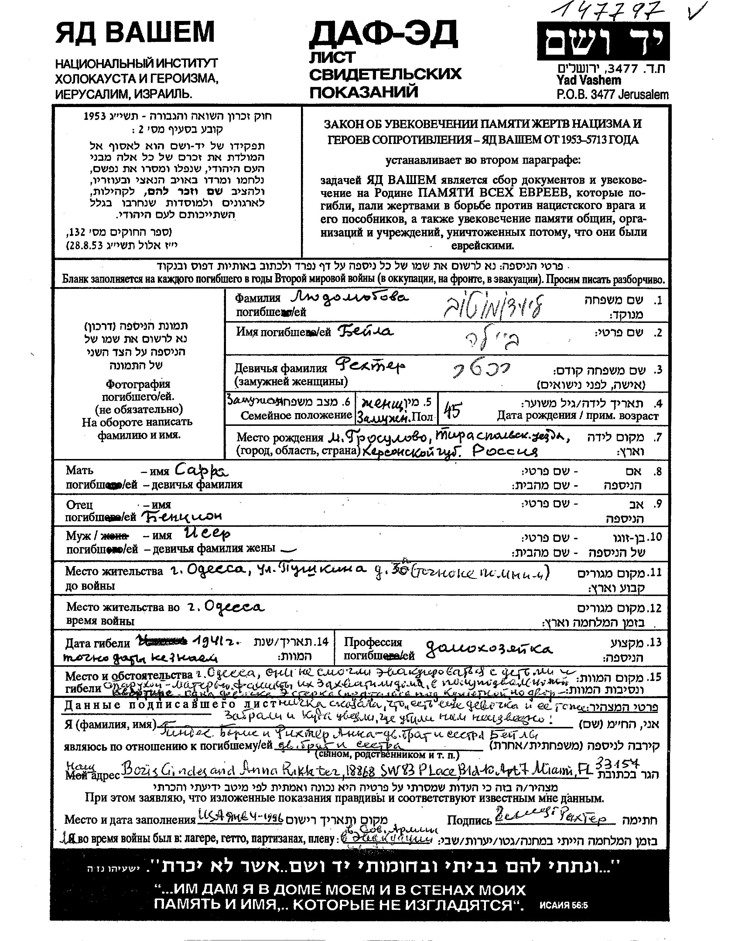 Lyudolyubova Beila Odessa, Ucrania (URSS) Hoja de Testimonio