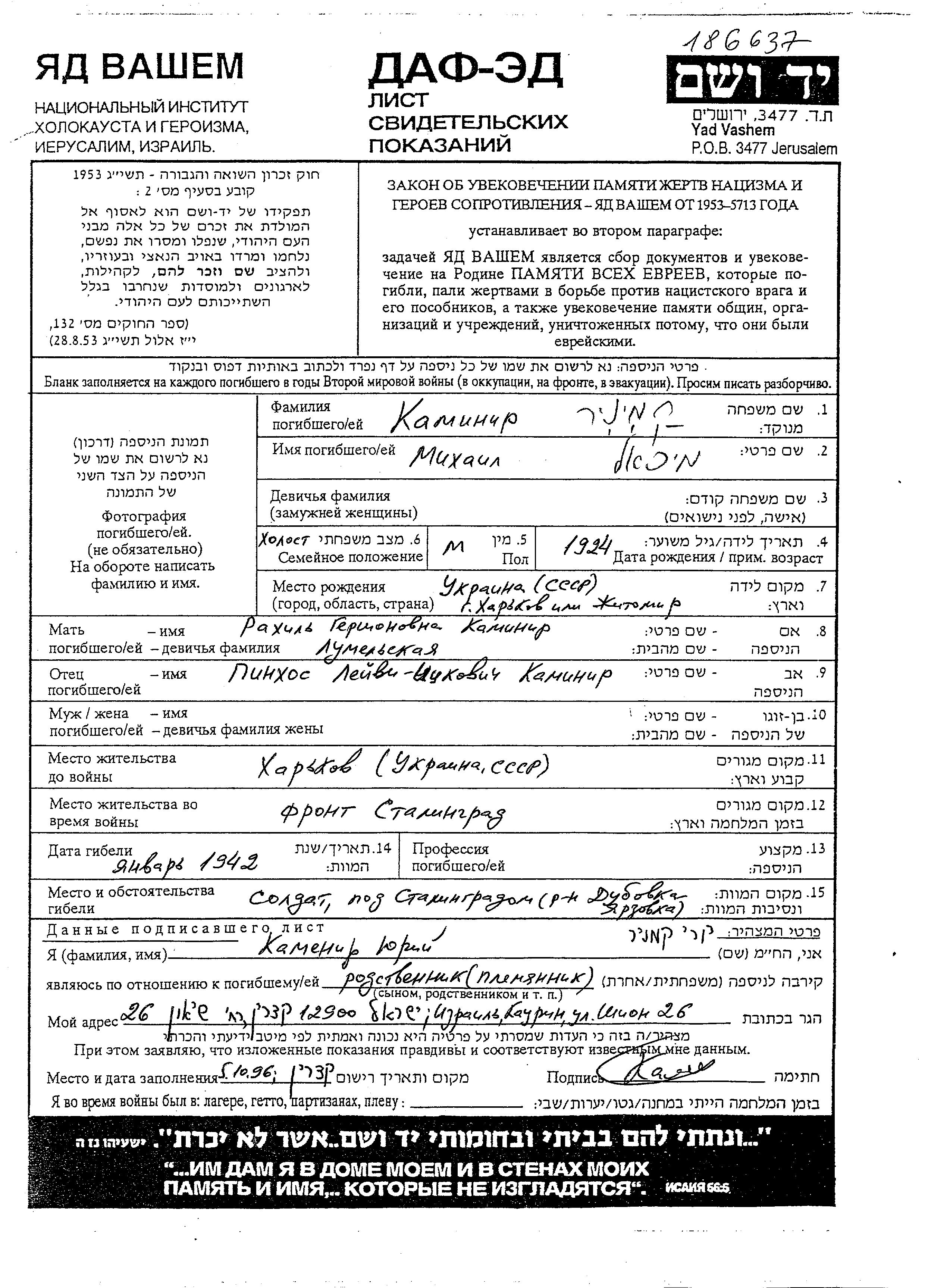 Mikhail Kaminer nació en Ucrania (URSS) en 1924, hijo de Pinkhos y Rakhil apellido de soltera Lumelski. Era Soltero. Antes de la segunda guerra mundial vivía en Kharkov, Ucrania (URSS). Durante la guerra estuvo en las fuerzas armadas soviéticas. Mikhail murió en servicio militar. Lugar de la muerte: Stalingrad, Rusia (URSS) en 1942.