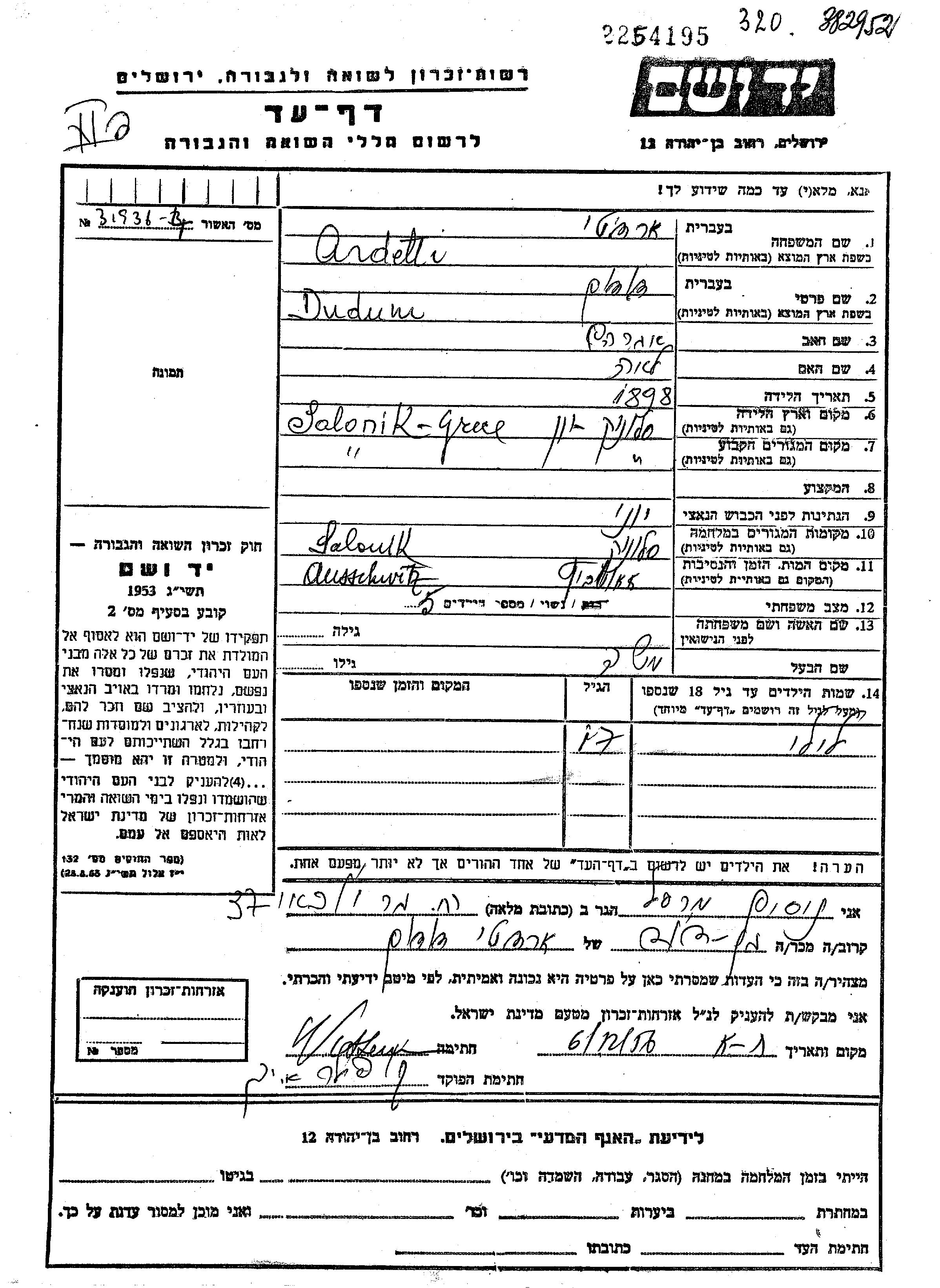 Dudum fue asesinada durante la Shoá. Lugar de la muerte: Saloniki, Grecia.