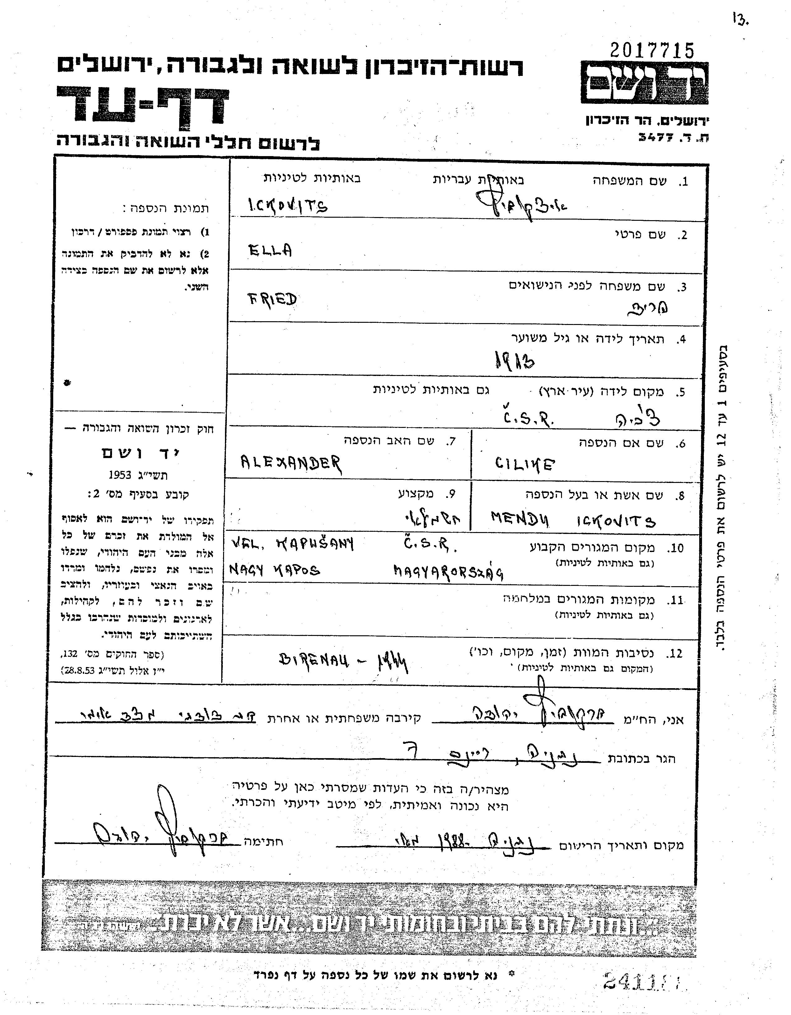 Ella Ickovits apellido de soltera Fried nació en Checoslovaquia en 1913, hija de Alexander y Cilike. Era casada con Mendu. Antes de la segunda guerra mundial vivía en Velke Kapusany, Checoslovaquia.