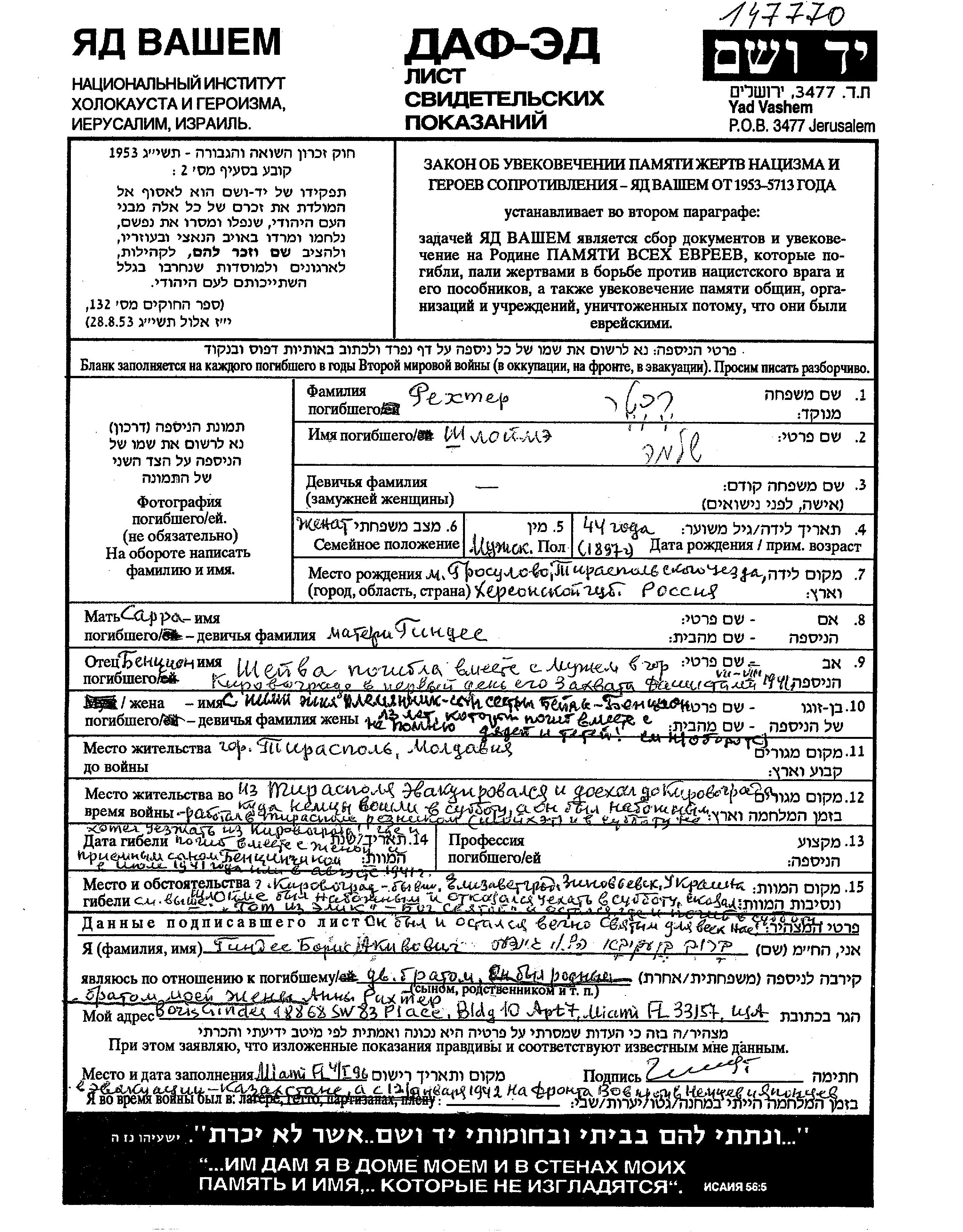 Rekhter Shloime 1897 lugar desconocido, Hoja de Testimonio