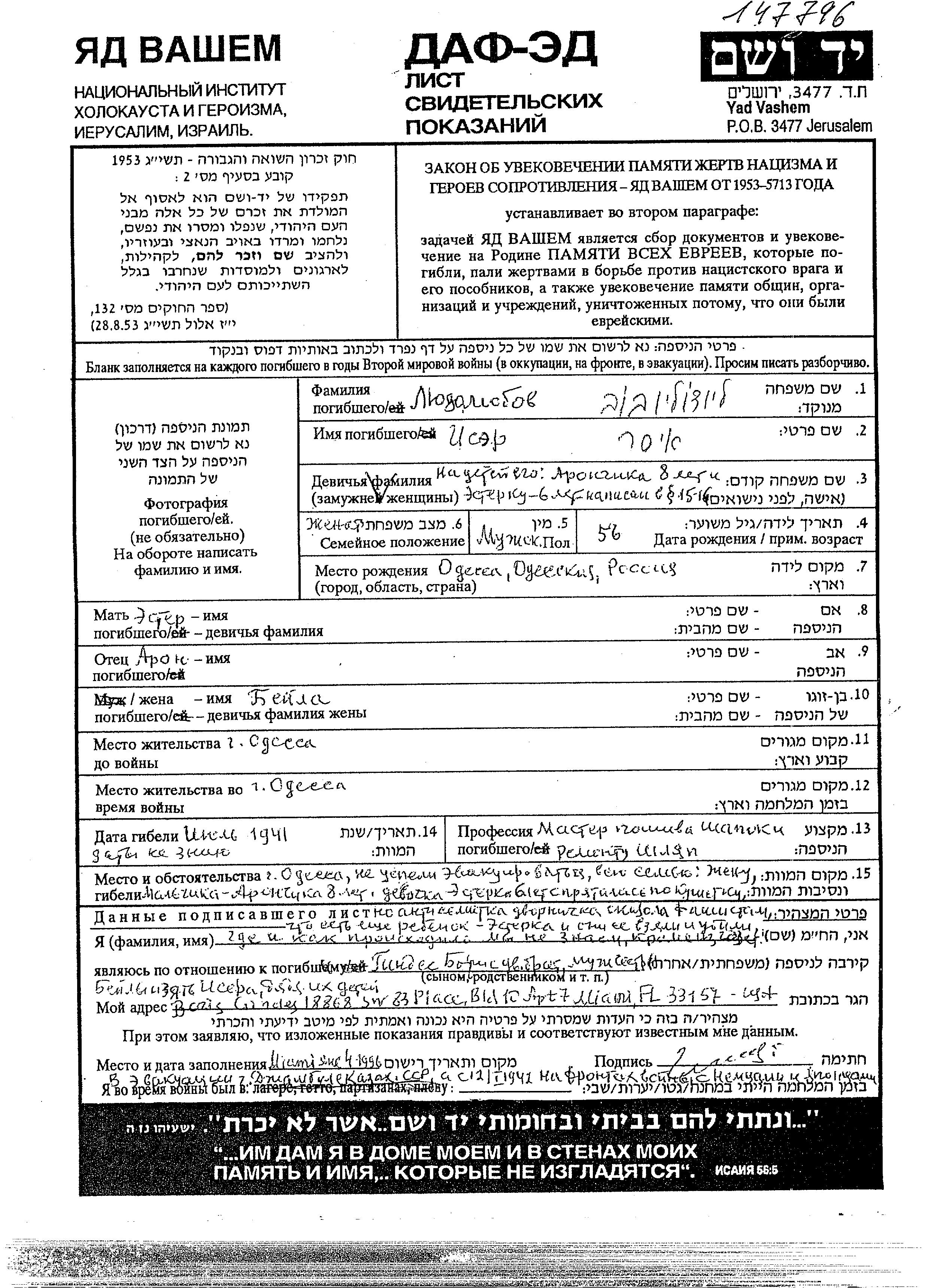 Lyudolyubova Esterka 1935 Odessa, Ucrania (URSS) Hoja de Testimonio