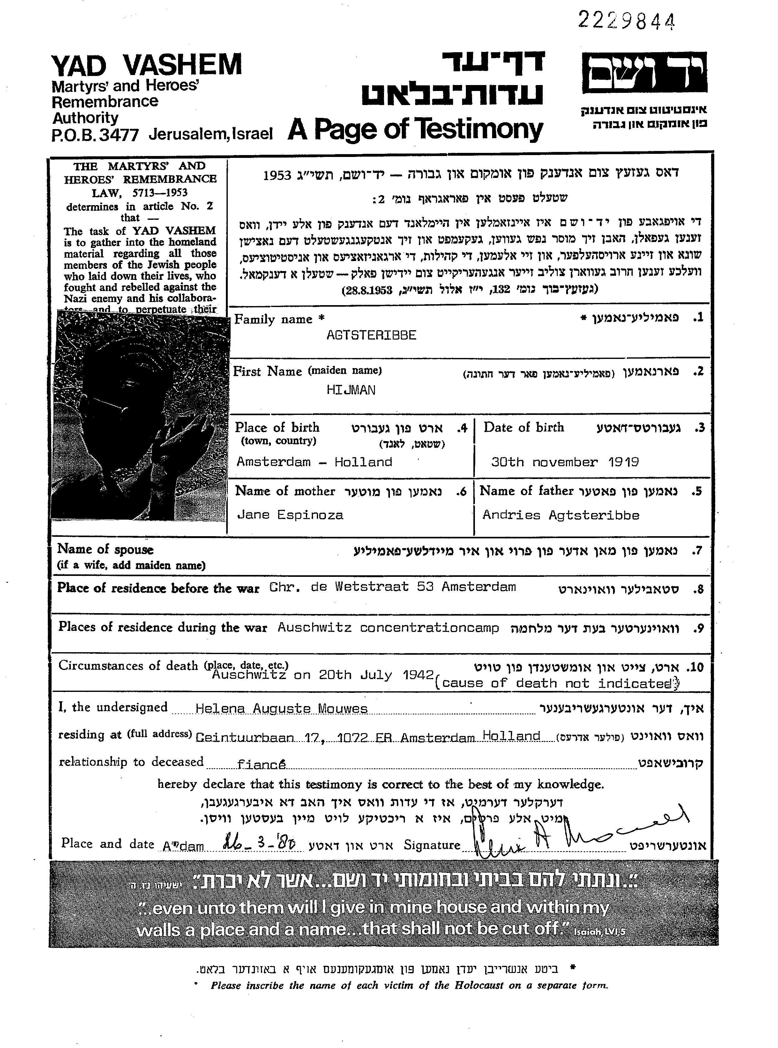 Agtsteribbe Hijman 1919 Amsterdam, Holanda Hoja de Testimonio