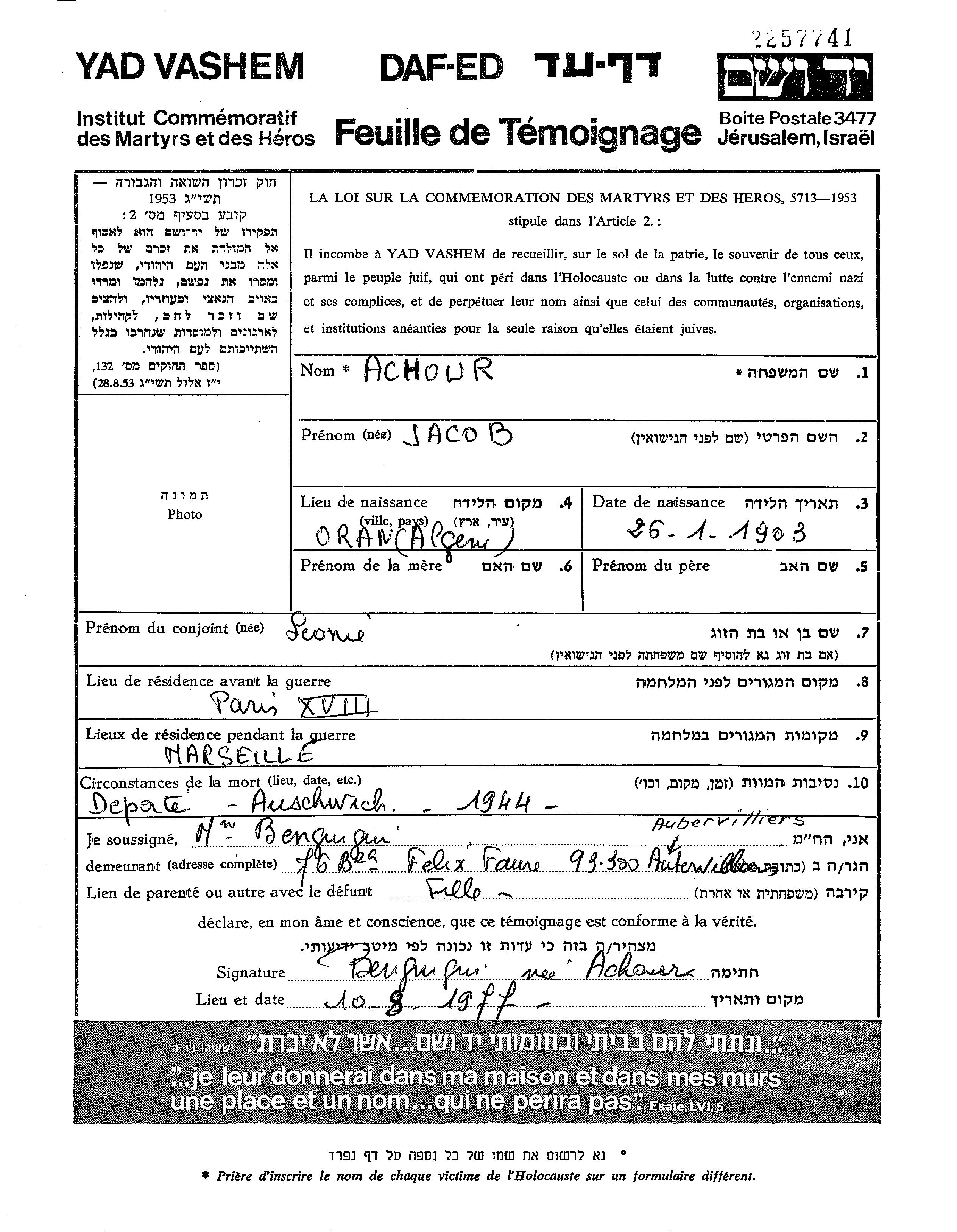 Jacob Achour nació en Oran, Argelia en 1903. Era Casado con Leona Leon. Antes de la segunda guerra mundial vivía en Paris, Francia. Durante la guerra estuvo en Marseille, Francia.