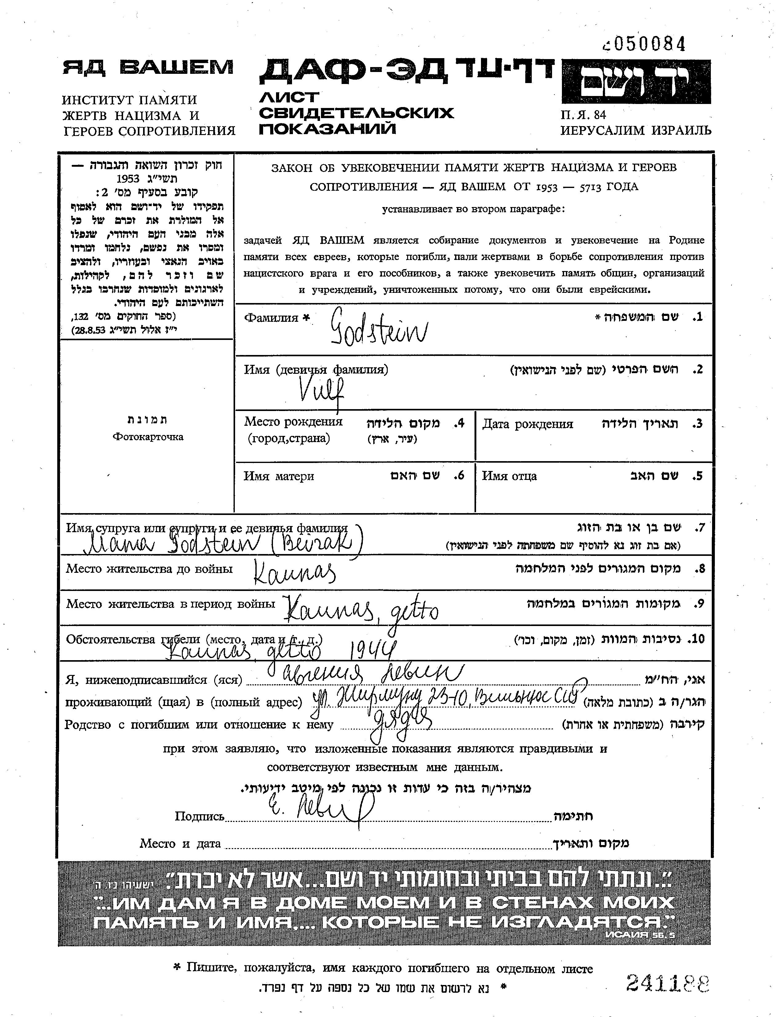Vulf Godstein. Era Casado con Mania. Antes de la segunda guerra mundial vivía en Kaunas, Lituania. Durante la guerra estuvo en Kaunas, Lituania.