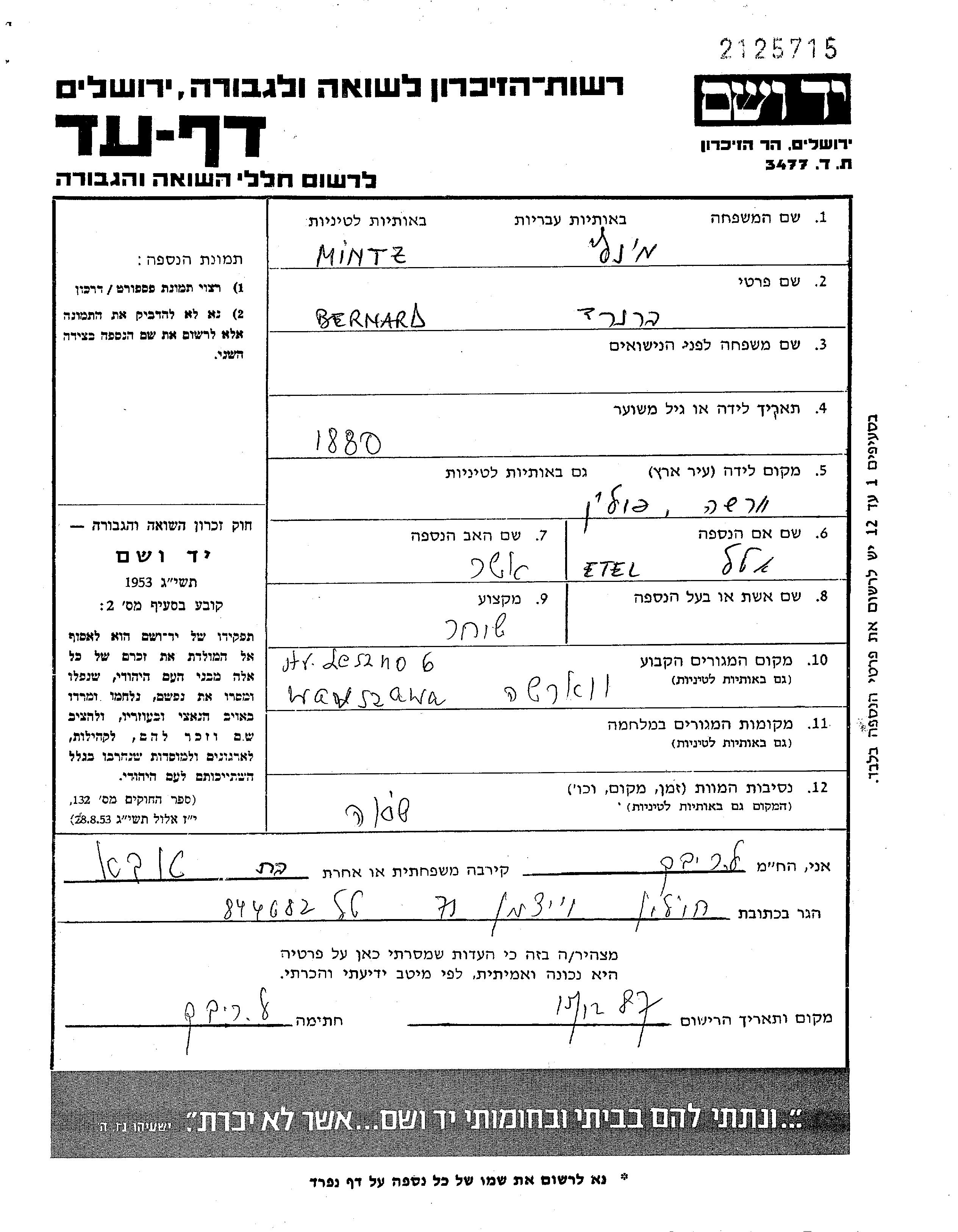 Bernard Mintz nació en Warszawa, Polonia en 1880, hijo de Uszer y Etel. Era Comereciante y Casado con Eugenja. Antes de la segunda guerra mundial vivía en Warszawa, Polonia.