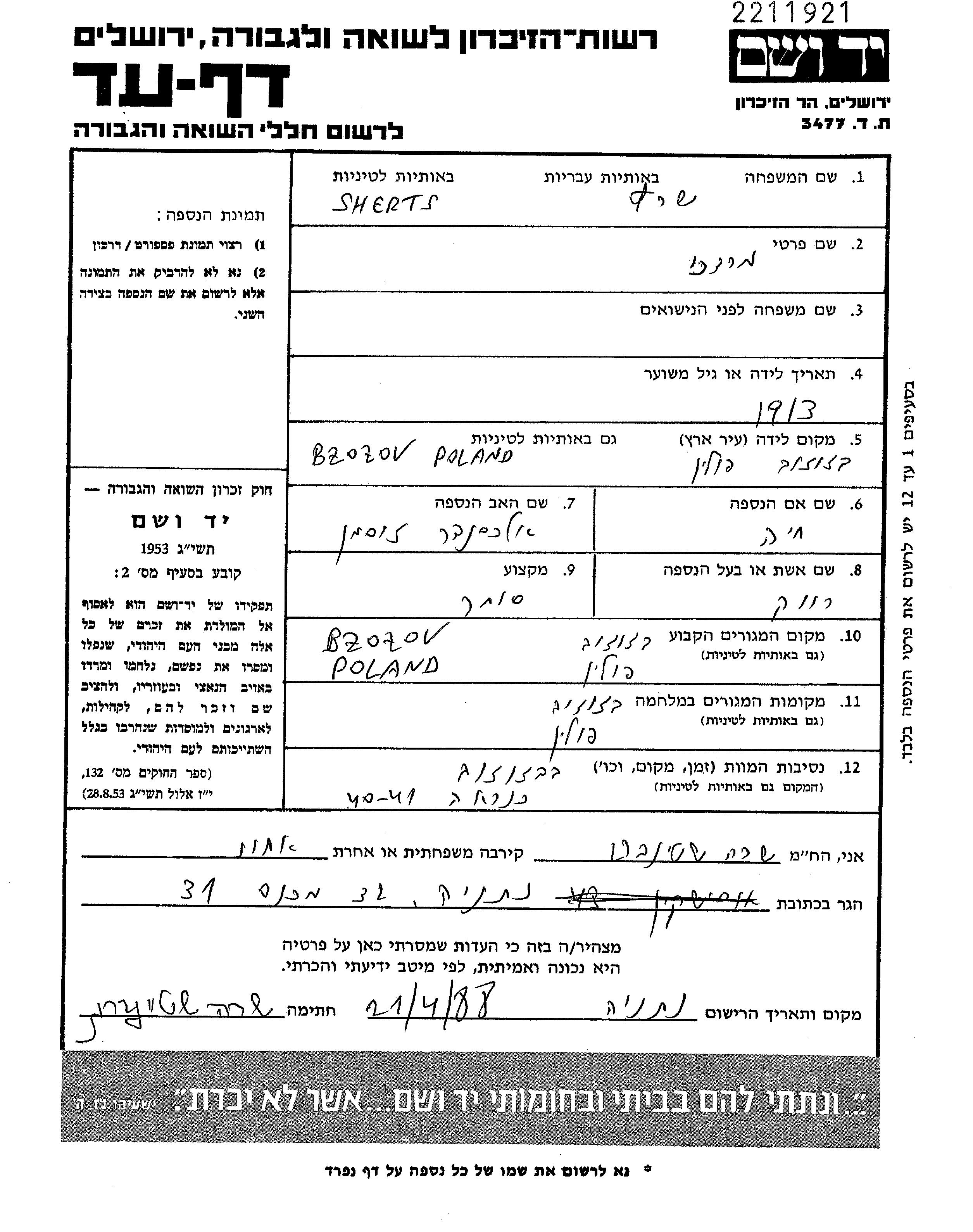Sherts Mordekhai 1913 Brzozow, Polonia Hoja de Testimonio