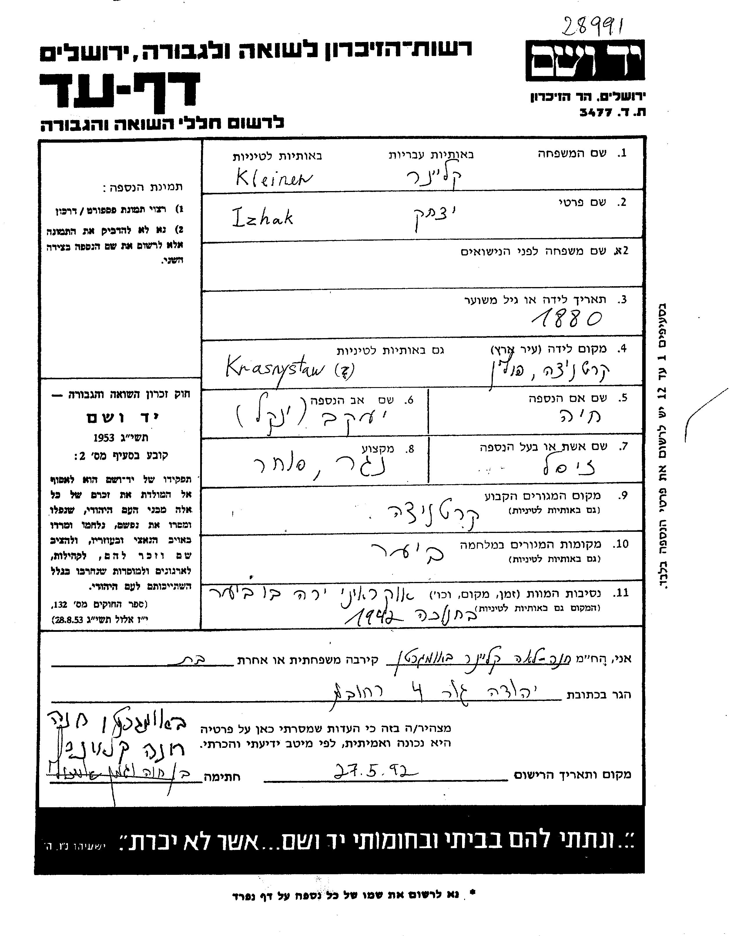 Izhak fue asesinado durante la Shoá. Lugar de la muerte: Ucrania (URSS) en 1942.