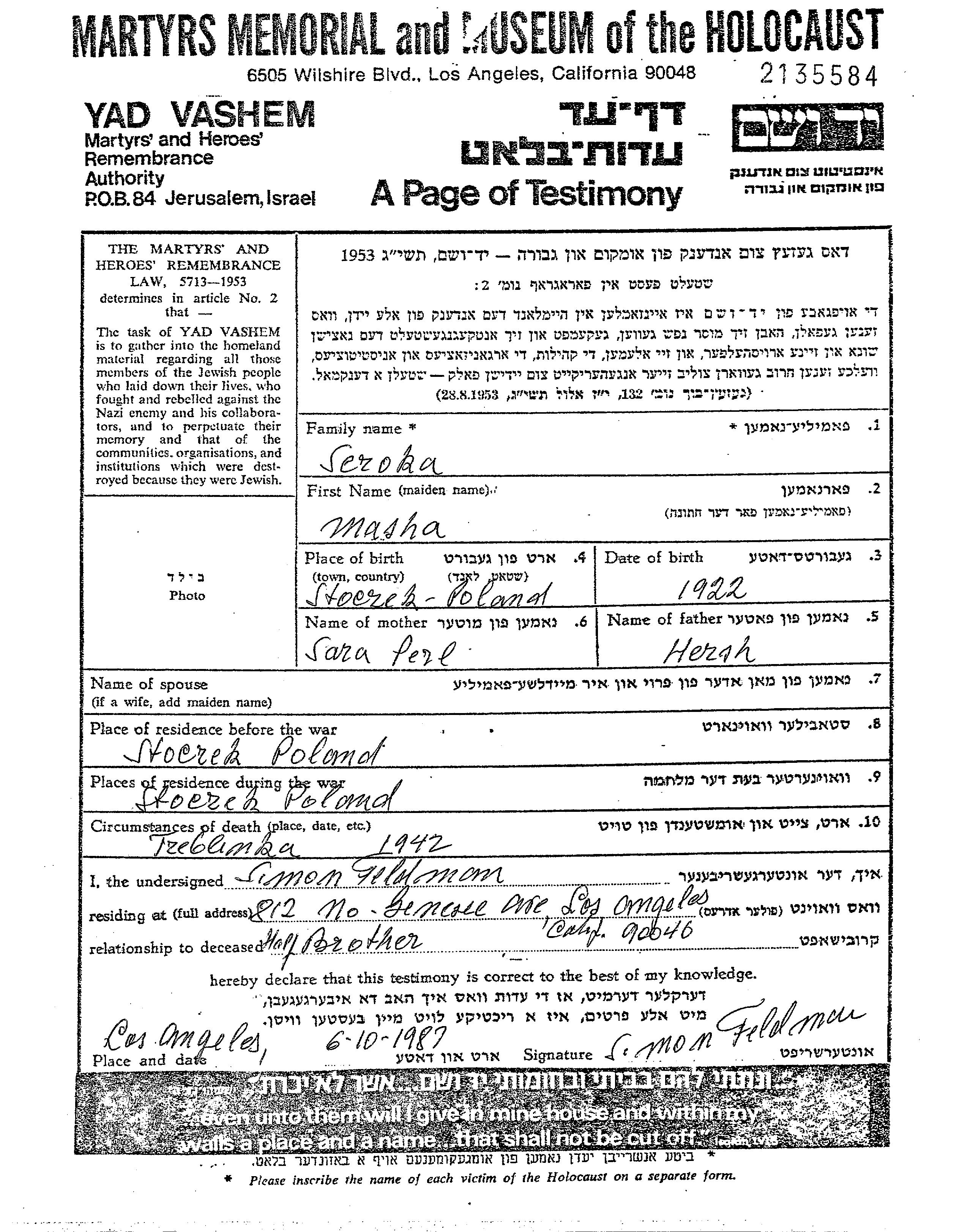 Masha Seroka Sroka nació en Stoczek, Polonia, hija de Hersh y Perl Sara apellido de soltera Gutreiman. Era Solteroa. Antes de la segunda guerra mundial vivía en Stoczek, Polonia. Durante la guerra estuvo en Stoczek, Polonia.