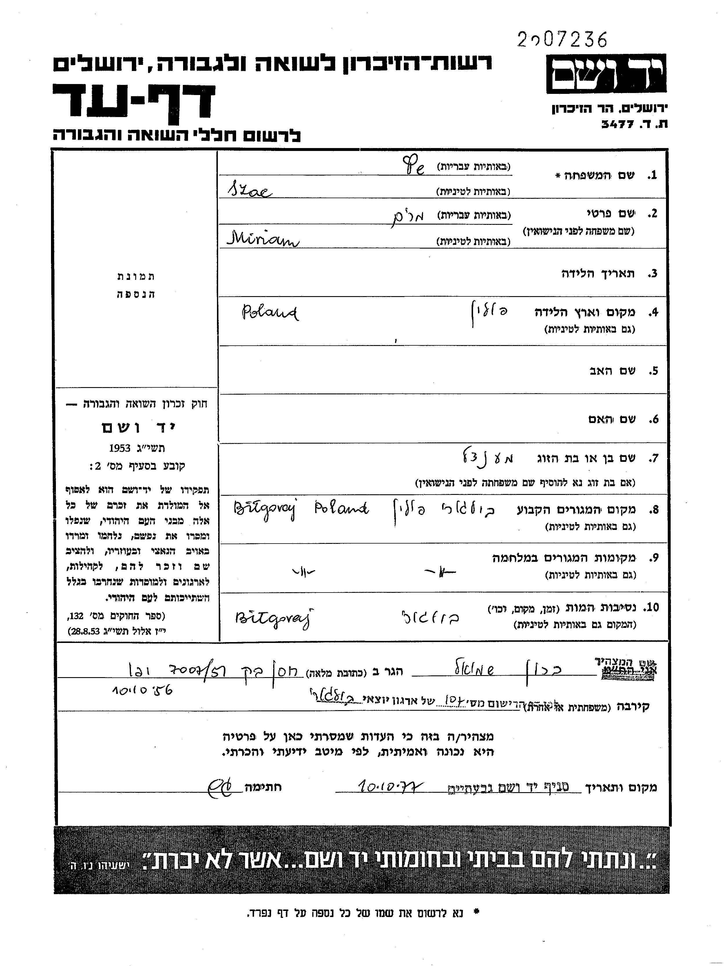 Szac Miriam lugar desconocido, Hoja de Testimonio