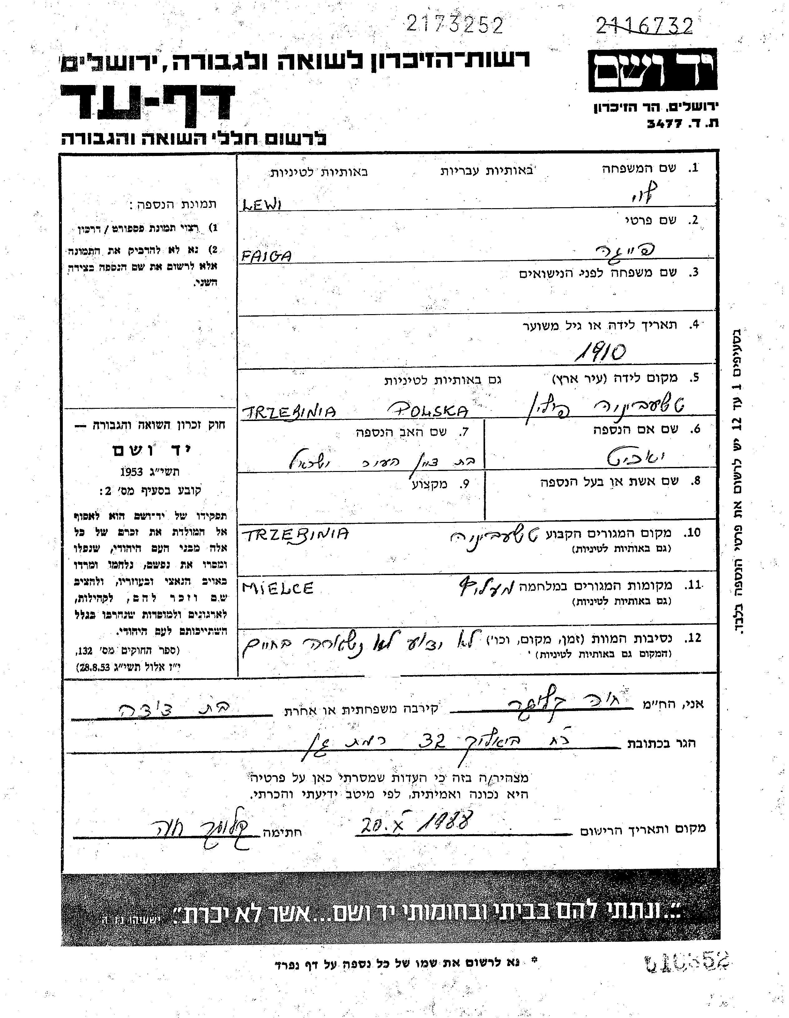 Lewi Faiga 1910 Trzebinia, Polonia Hoja de Testimonio