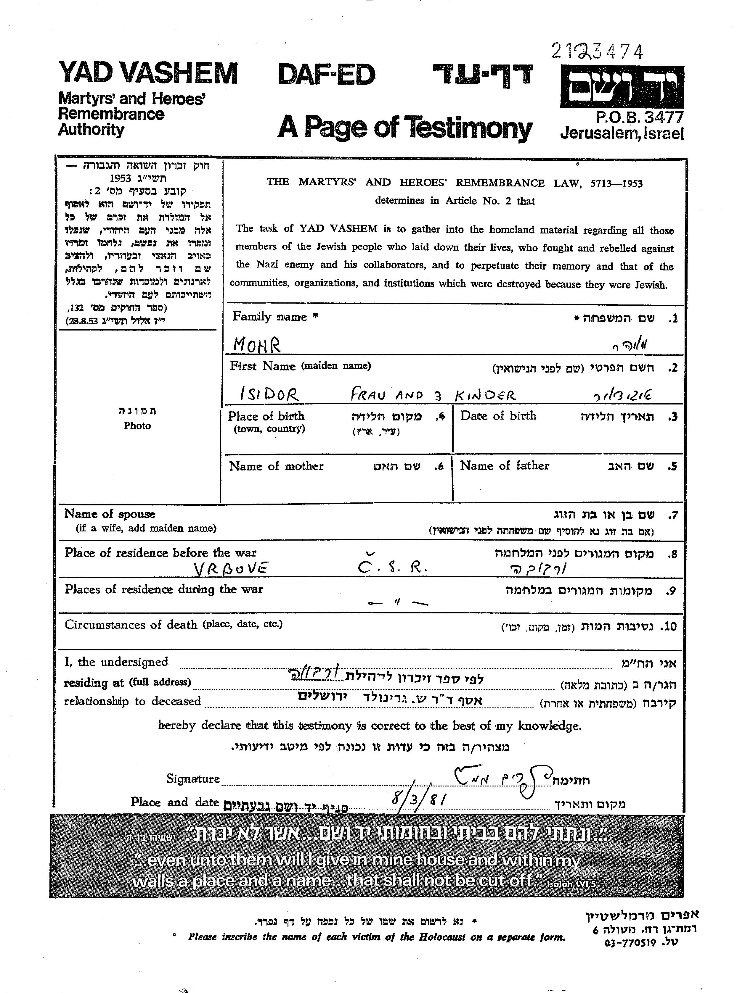 Mohr Isidor Vrbove, Checoslovaquia Hoja de Testimonio