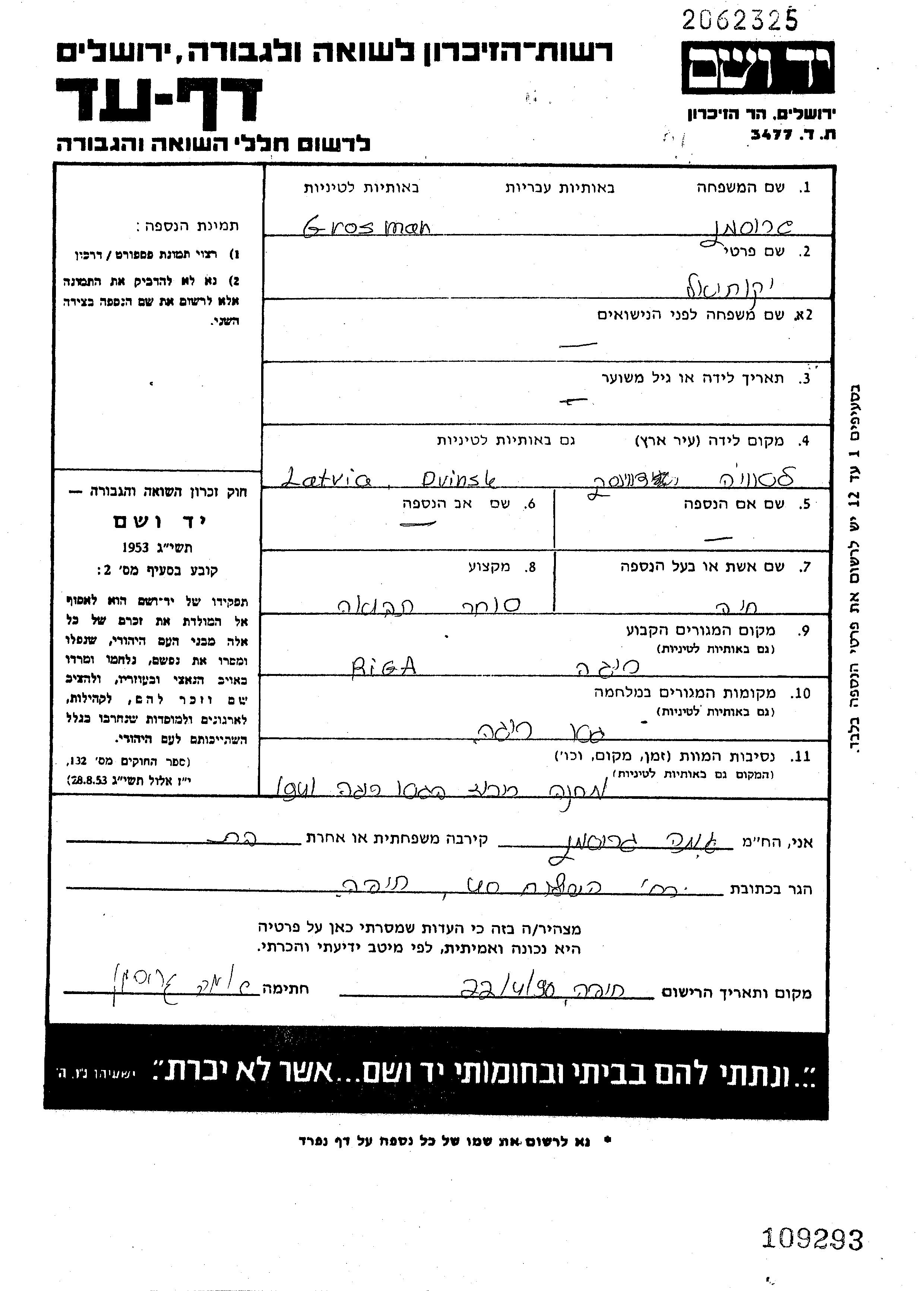 Grosman Yekutiel Riga, Letonia Hoja de Testimonio