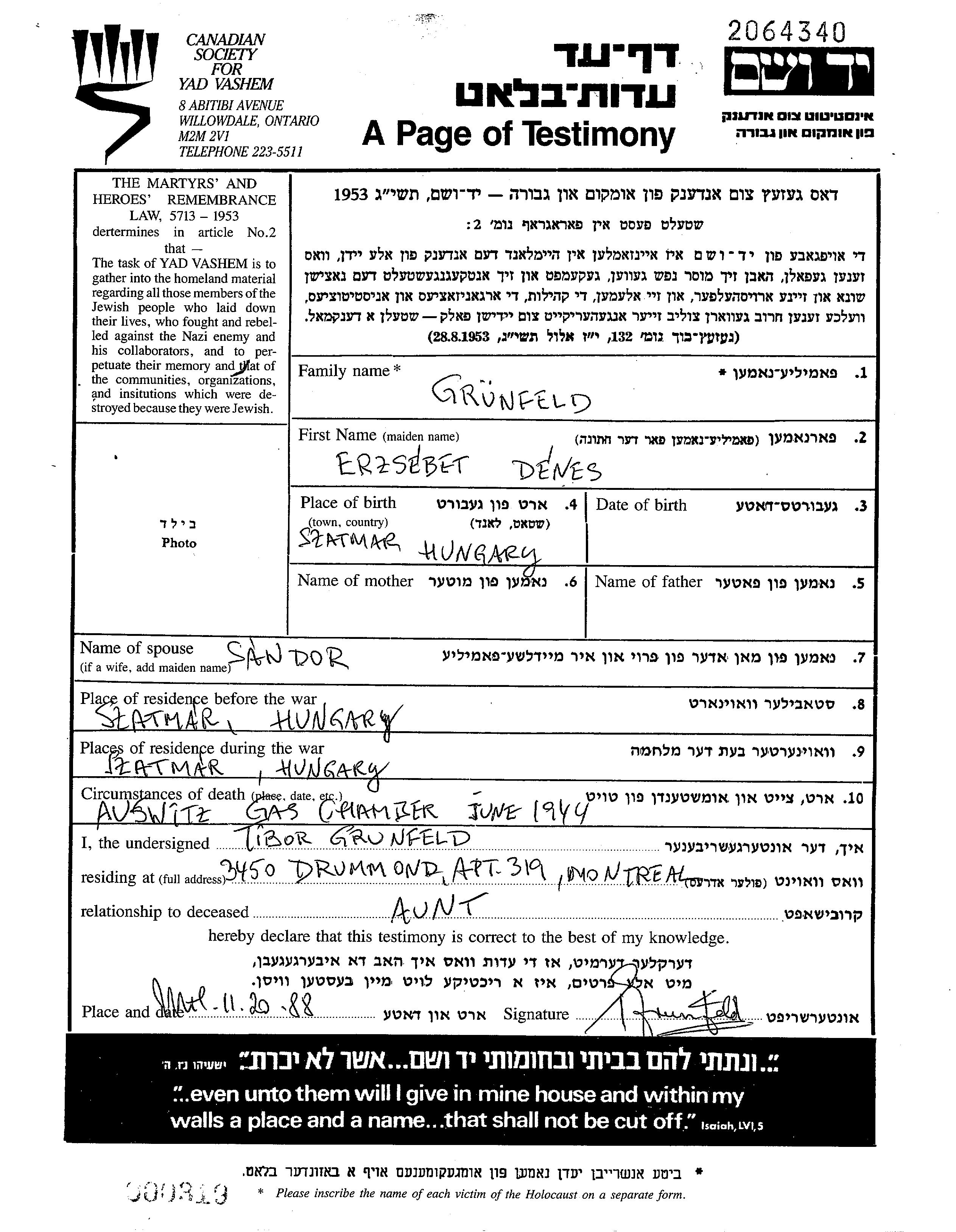 Erzsebet Gruenfeld apellido de soltera Denes nació en Szatmar, Rumania. Era casada con Sandor. Antes de la segunda guerra mundial vivía en Szatmar, Rumania. Durante la guerra estuvo en Szatmar, Rumania.