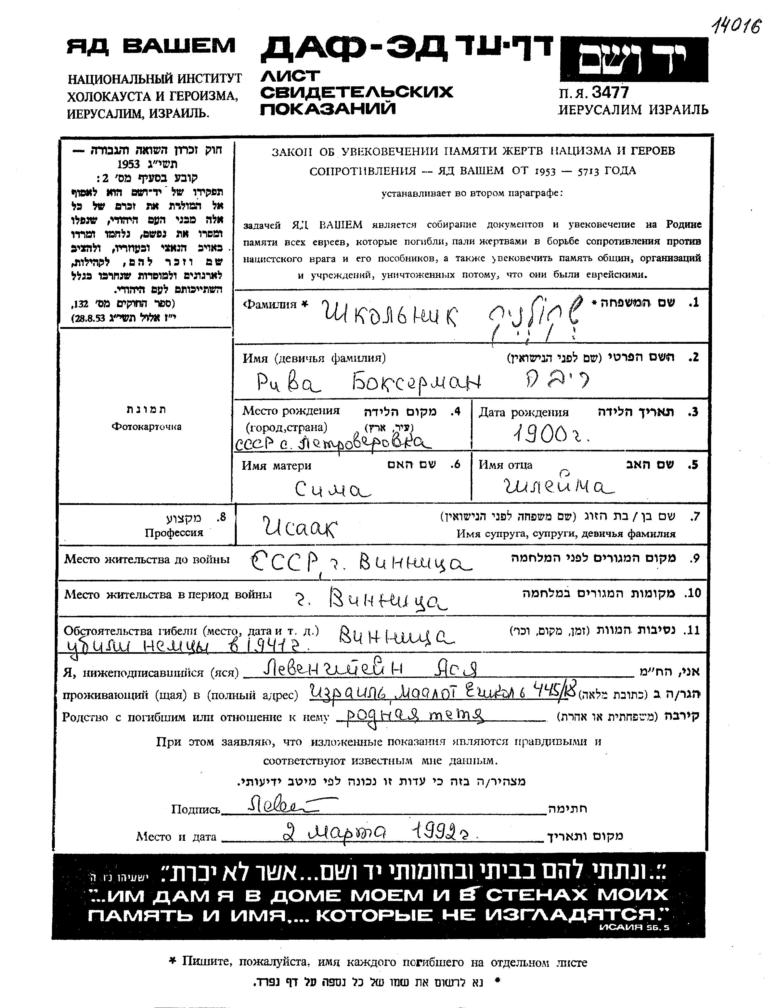 Riva Shkolnik apellido de soltera Bokserman nació en Petroverovka, Ucrania (URSS) en 1900, hija de Shleima y Sima. Era casada con Isaak. Antes de la segunda guerra mundial vivía en Vinnitsa, Ucrania (URSS). Durante la guerra estuvo en Vinnitsa, Ucrania (URSS).