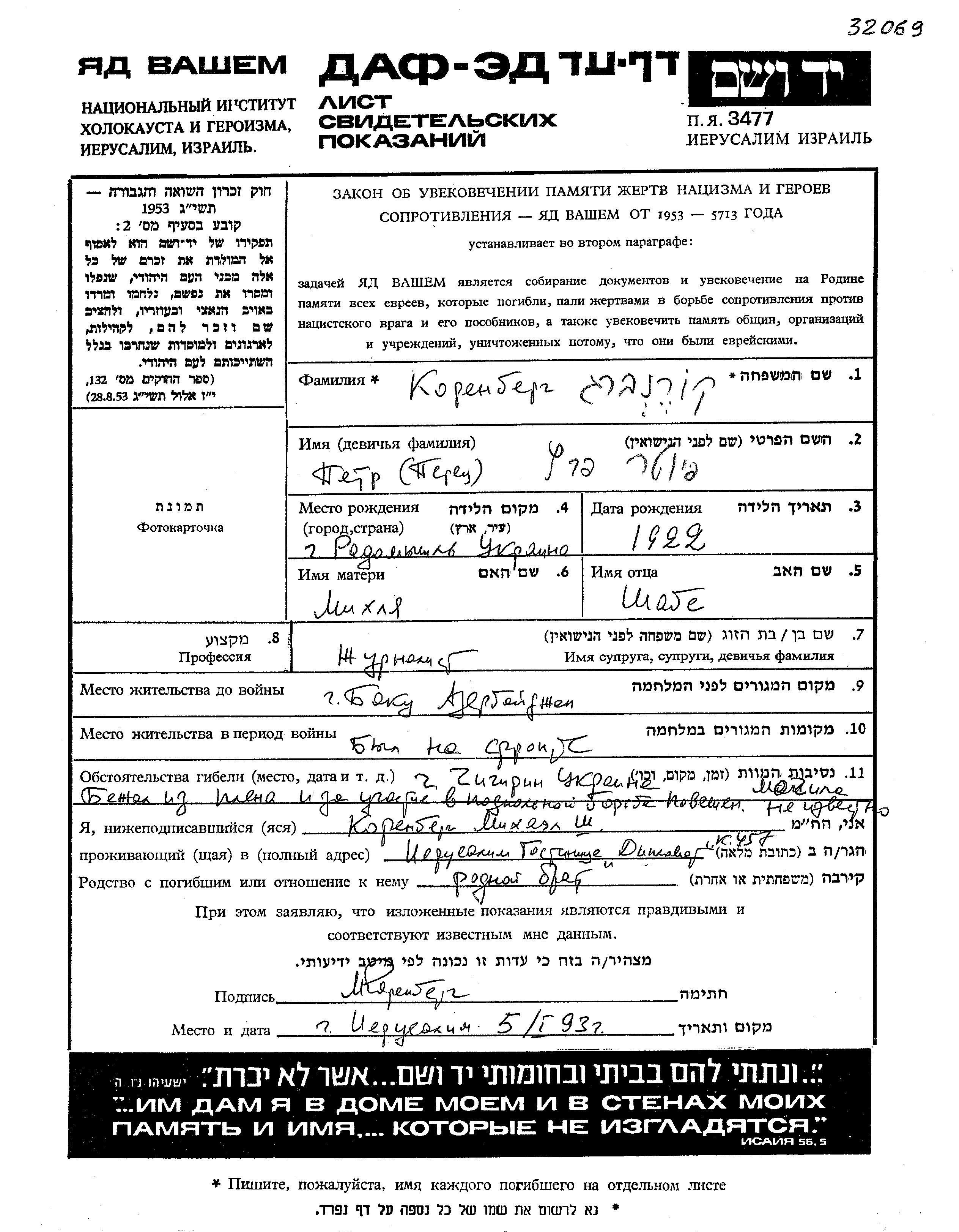 Korenberg Piotr Perets 1922 Baku, Azerbaiján (URSS) Hoja de Testimonio
