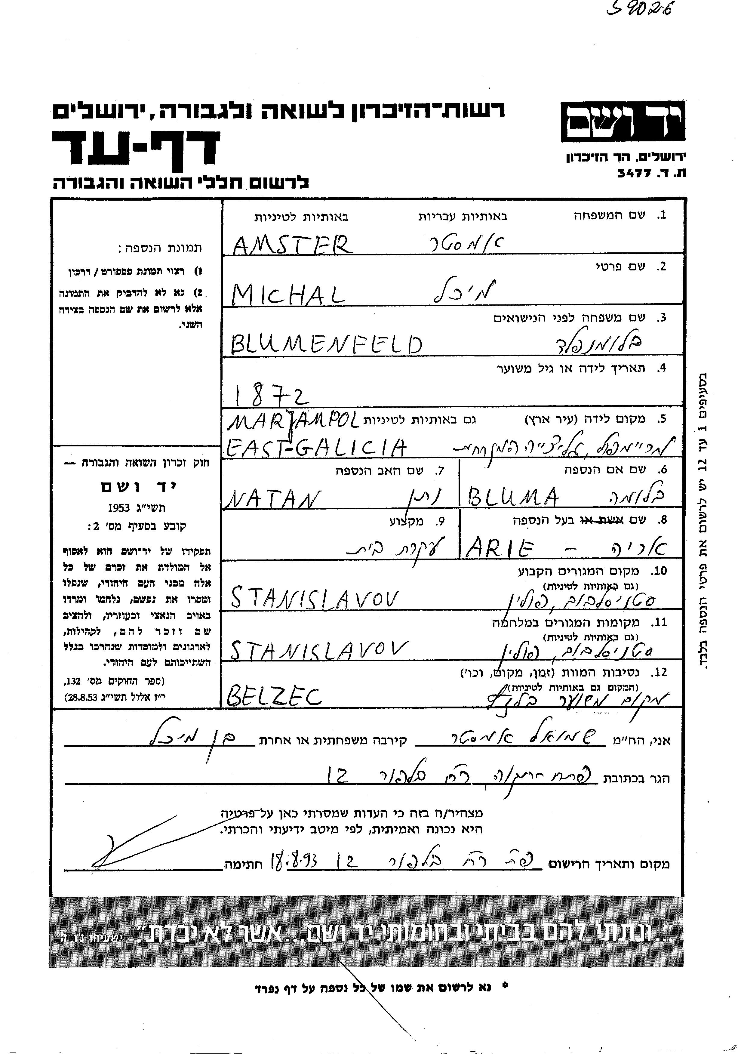 Michal Mikhal Amster apellido de soltera Blumenfeld nació en Marjampol, Polonia en 1872, hija de Natan y Bluma. Era Ama de casa y casada con Arie Yehuda Leib. Antes de la segunda guerra mundial vivía en Stanislawow, Polonia. Durante la guerra estuvo en Stanislawow, Polonia.
