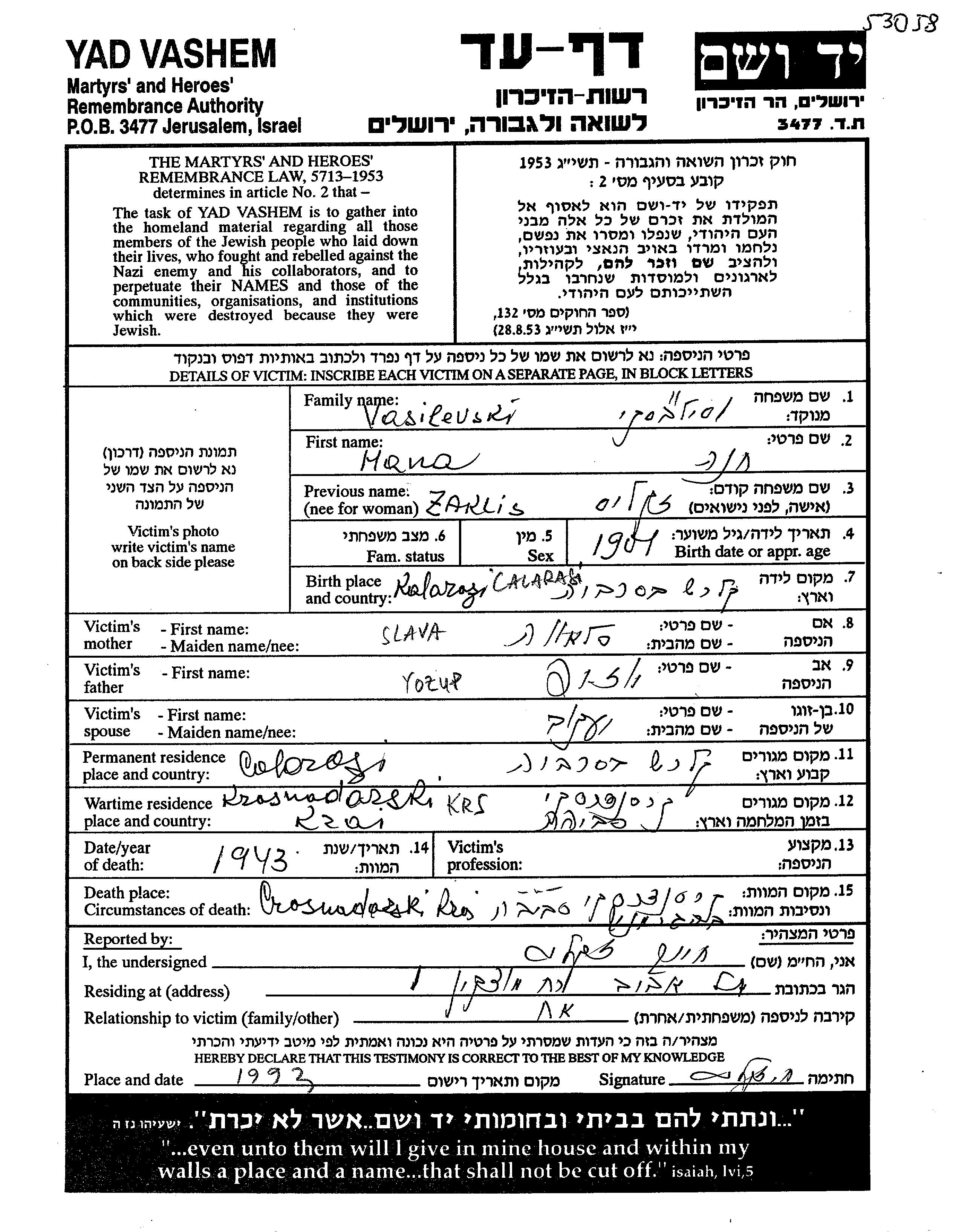 Vasilevski Hana 1901 Călărași, Rumania Hoja de Testimonio