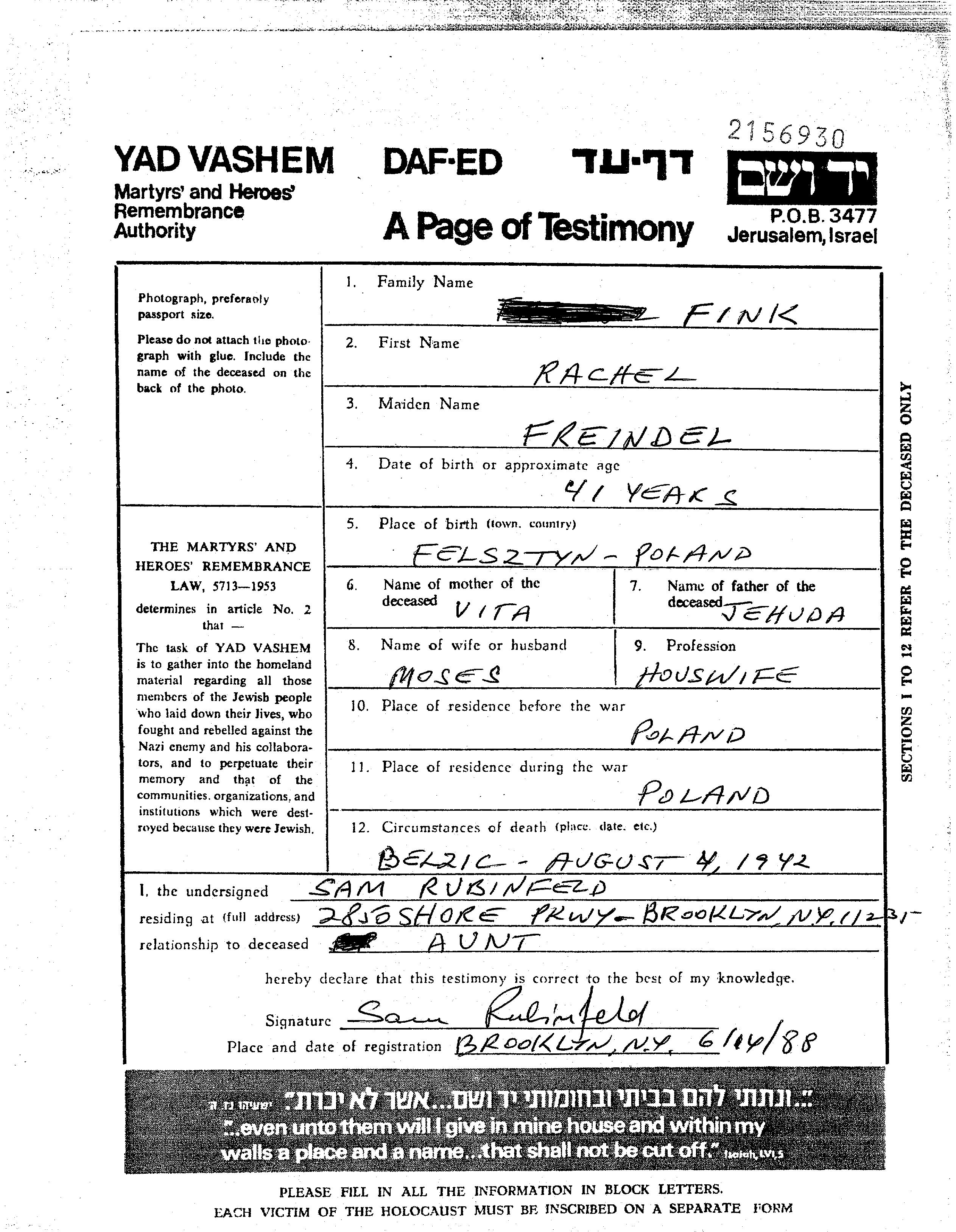Rachel Fink apellido de soltera Freindel nació en Felsztyn, Polonia en 1901, hija de Jehuda y Vita. Era Ama de casa y casada con Moses. Antes de la segunda guerra mundial vivía en Polonia. Durante la guerra estuvo en Polonia.