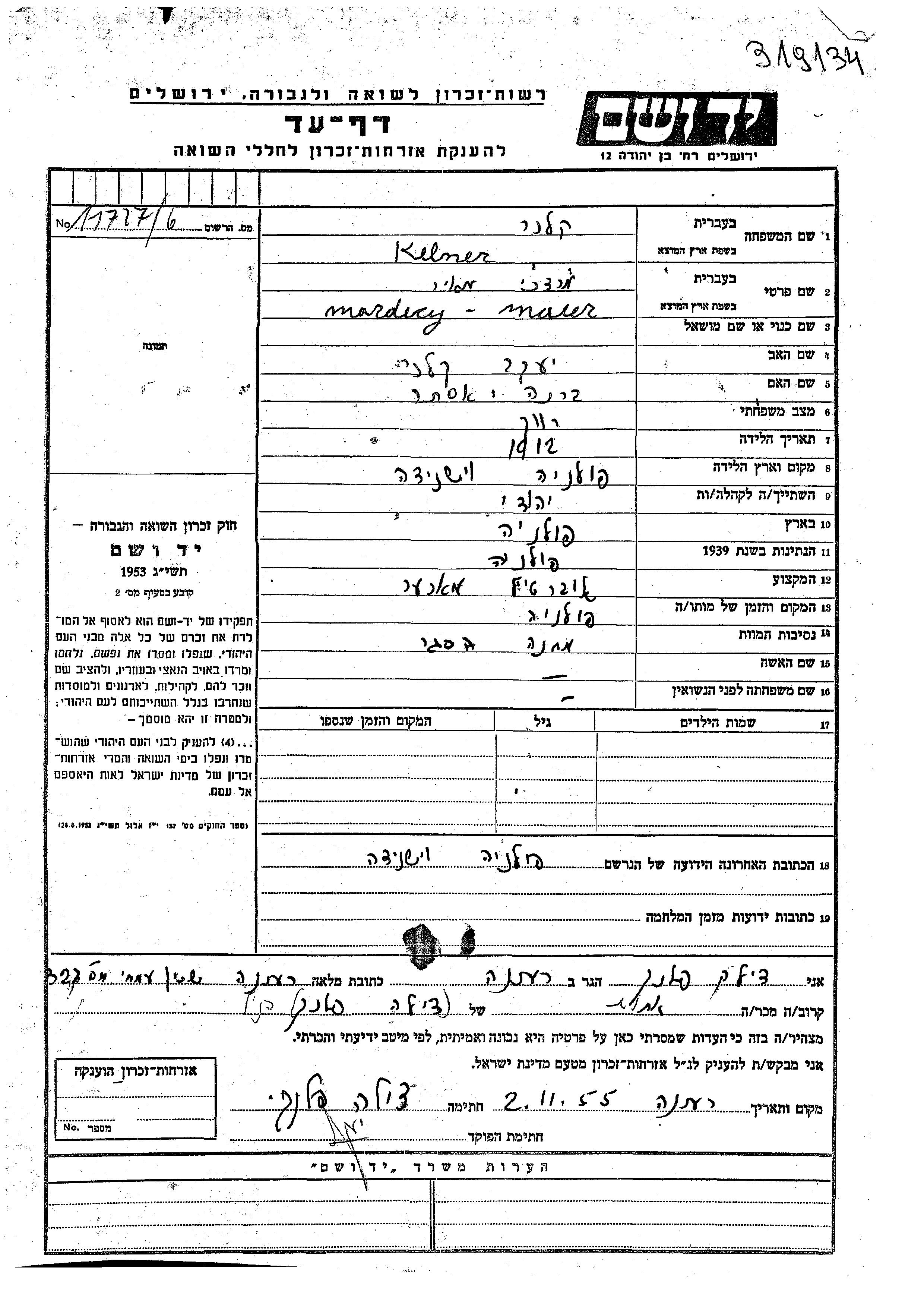 Mordecy Mair Kelner Klaner nació en Wisnice, Polonia en 1912, hijo de Yaakov y Brana Ester. Era אובערטייל מאכער. Antes de la segunda guerra mundial vivía en Wisnice, Polonia. Durante la guerra estuvo en Wisnice, Polonia.