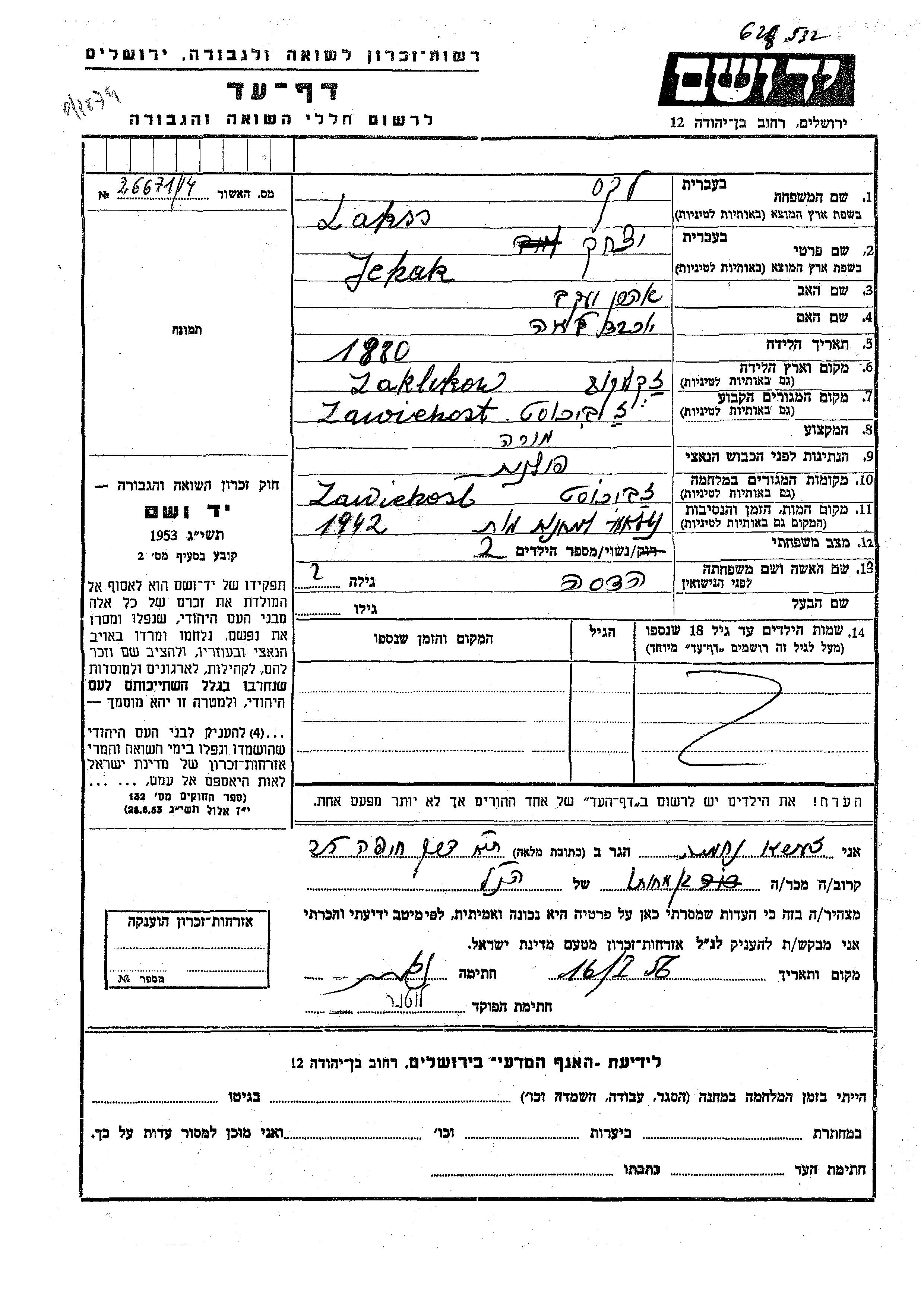 Ichak Lakss nació en Zaklikow, Polonia en 1880, hijo de Aharon Yaakov y Yokheved Lea. Era Maestro y Casado con Hadasa. Antes de la segunda guerra mundial vivía en Zawichost, Polonia. Durante la guerra estuvo en Zawichost, Polonia.