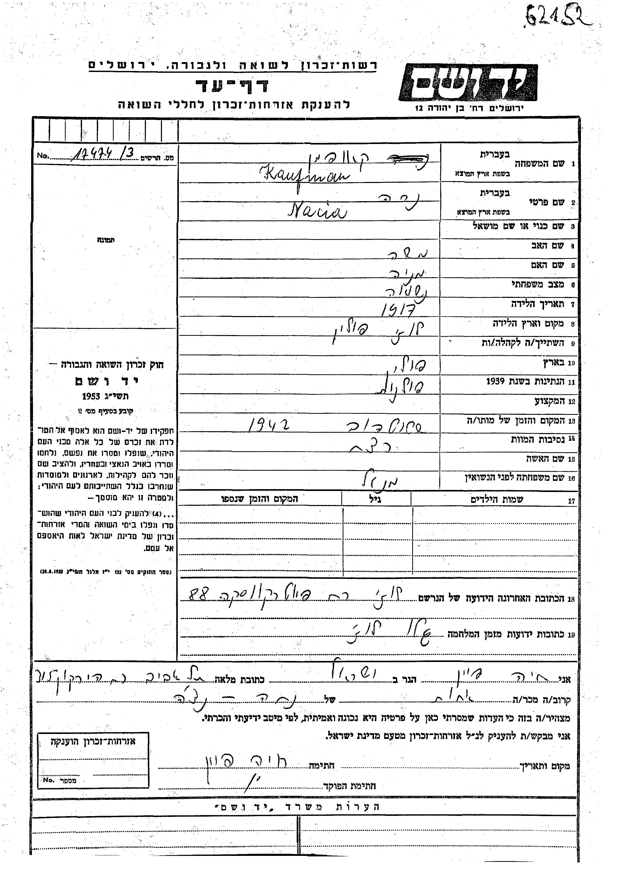 Naria Kaufman apellido de soltera Mental nació en Lodz, Polonia en 1917, hija de Moshe y Mania. Era casada. Durante la guerra estuvo en Lodz, Polonia.