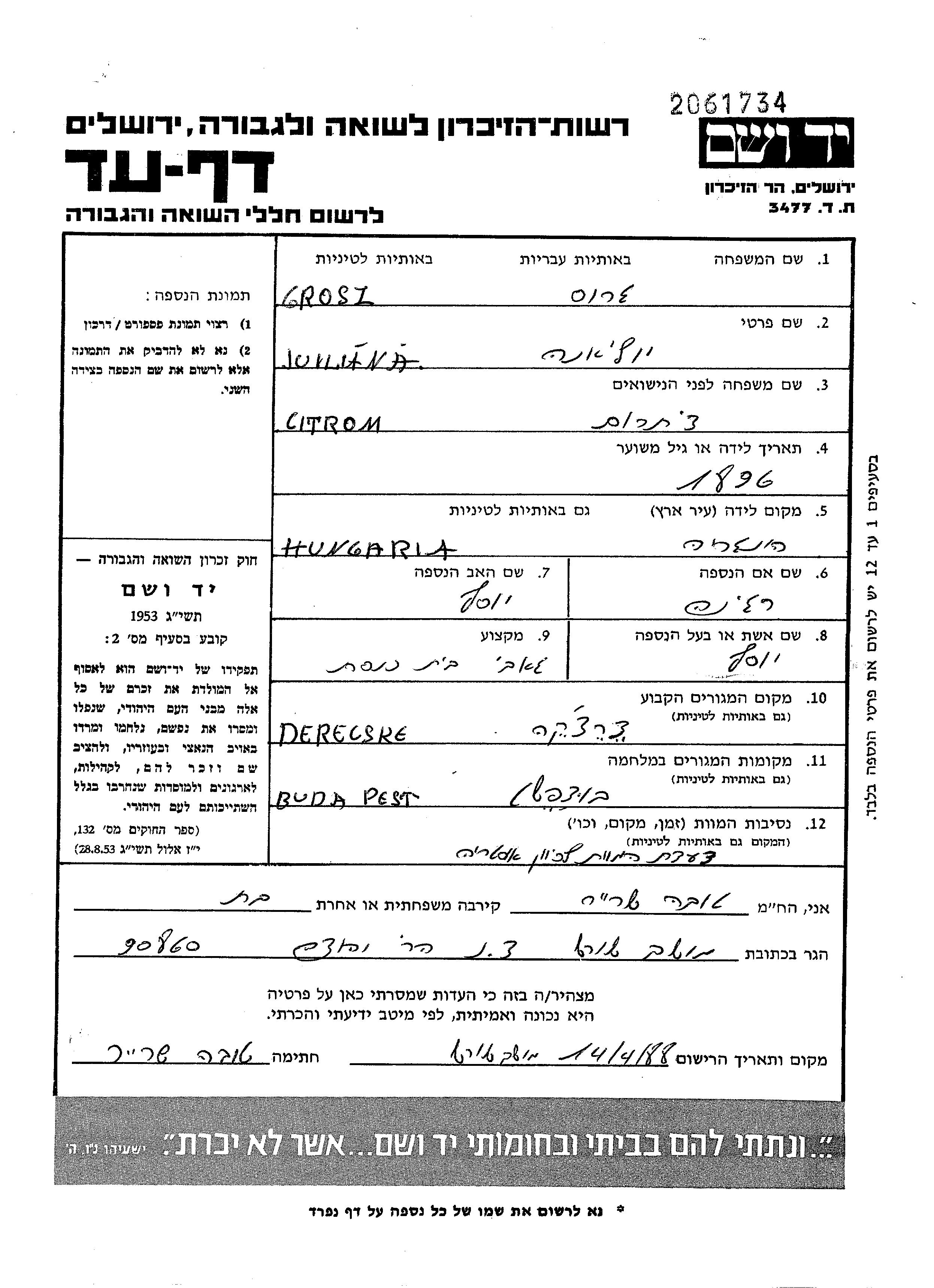 Juiliana Iuliana Grosz apellido de soltera Citrom nació en Hungría en 1896, hija de Yosef y Regina. Era Bedel y casada con Yosef. Antes de la segunda guerra mundial vivía en Derecske, Hungría. Durante la guerra estuvo en Budapest, Hungría.