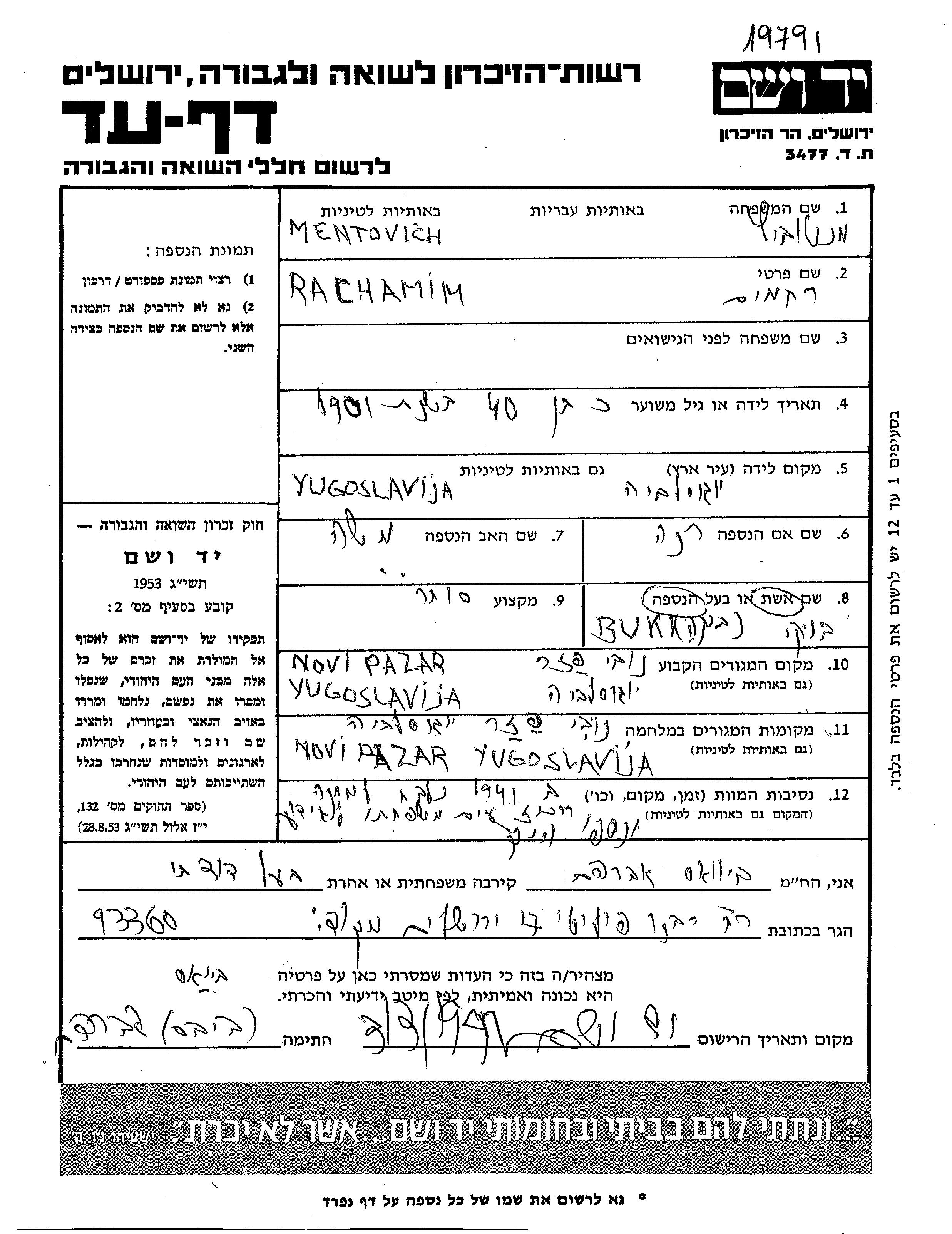 Rachamim Mentovich nació en Yugoslavia en 1901, hijo de Moshe y Rena Rene. Era Comereciante y Casado con Buki. Antes de la segunda guerra mundial vivía en Novi Pazar, Yugoslavia. Durante la guerra estuvo en Novi Pazar, Yugoslavia.