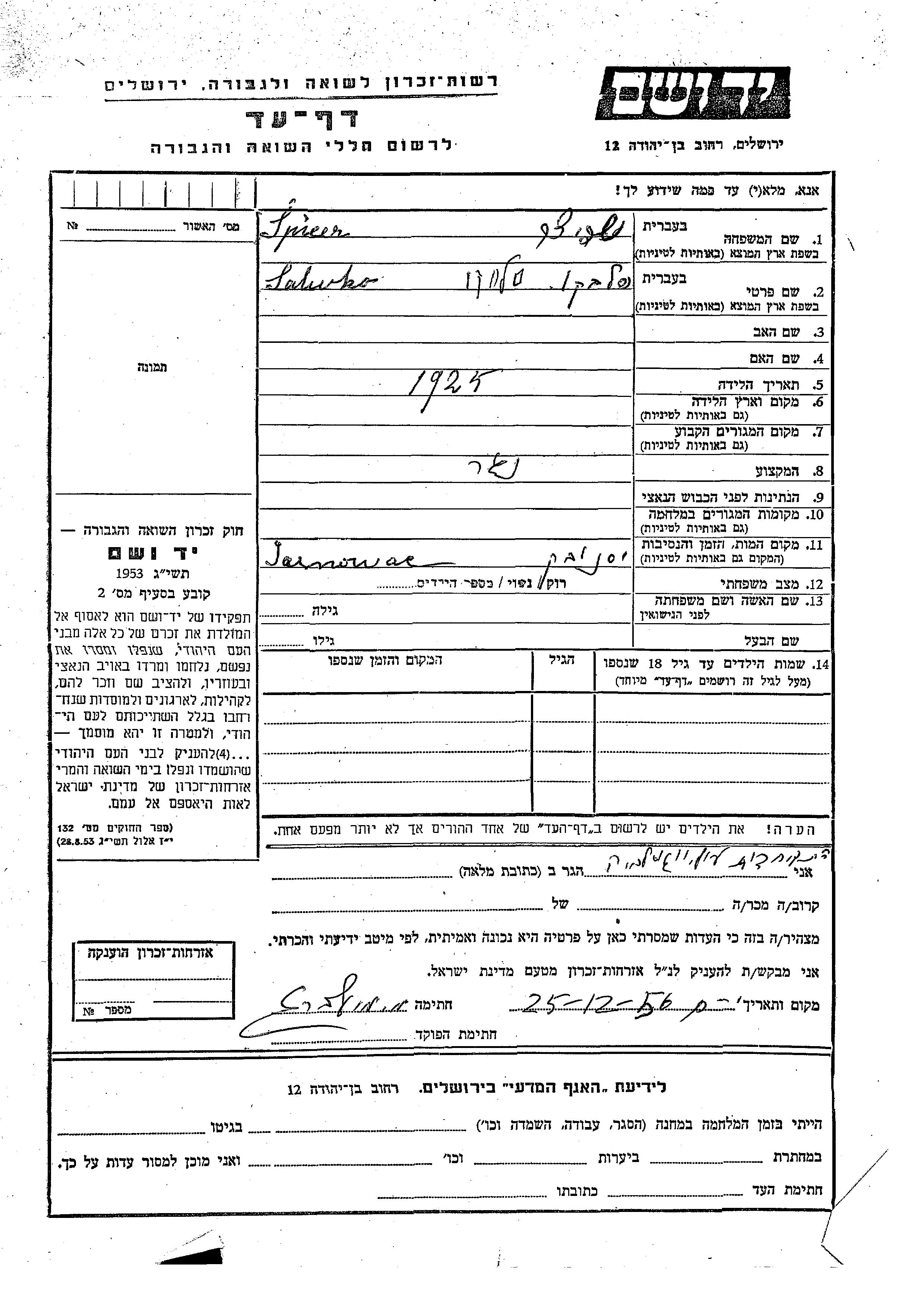 Spicer Slawko 1925 lugar desconocido, Hoja de Testimonio
