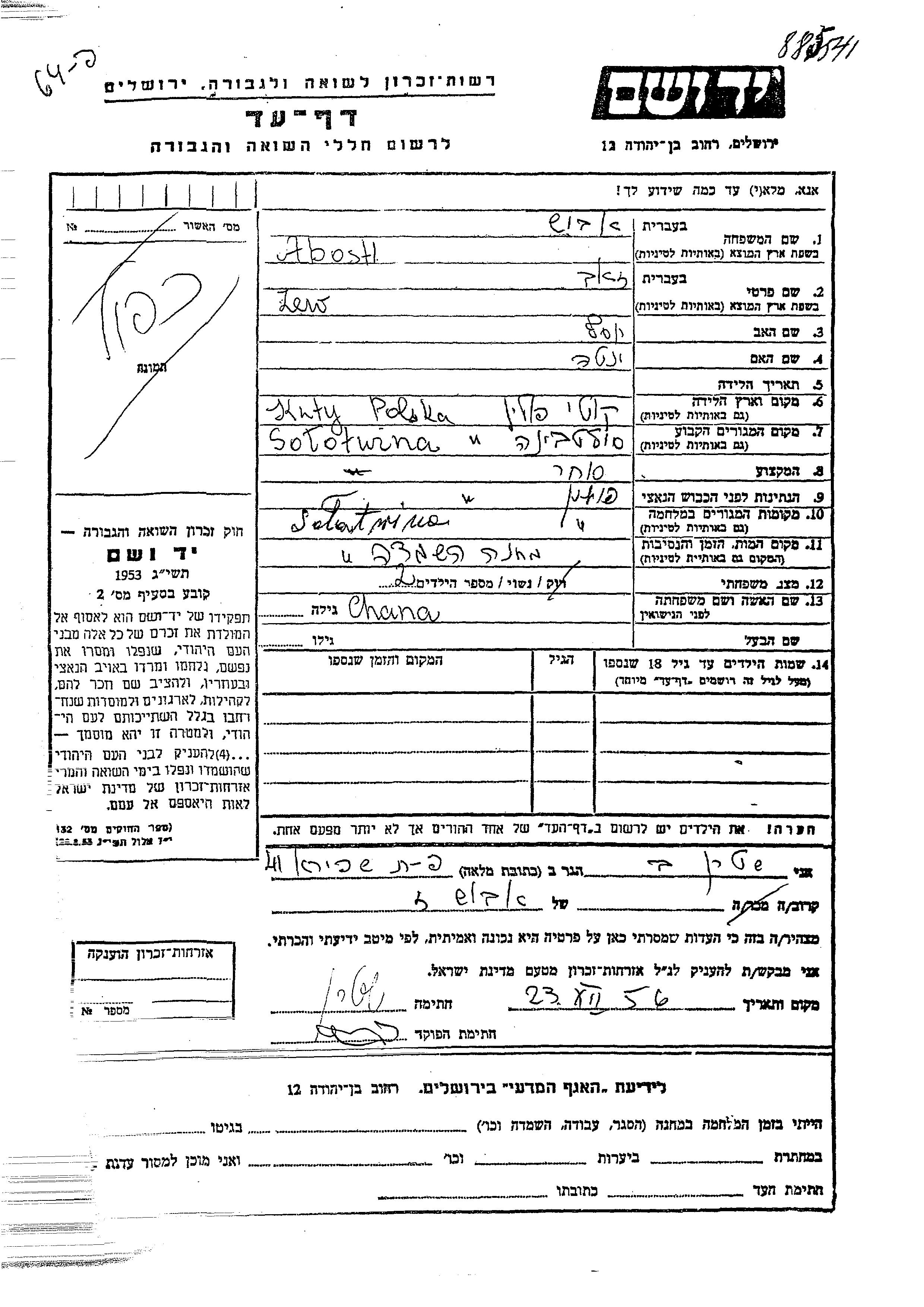 Abosh Lew Zeev Solotwina, Polonia Hoja de Testimonio