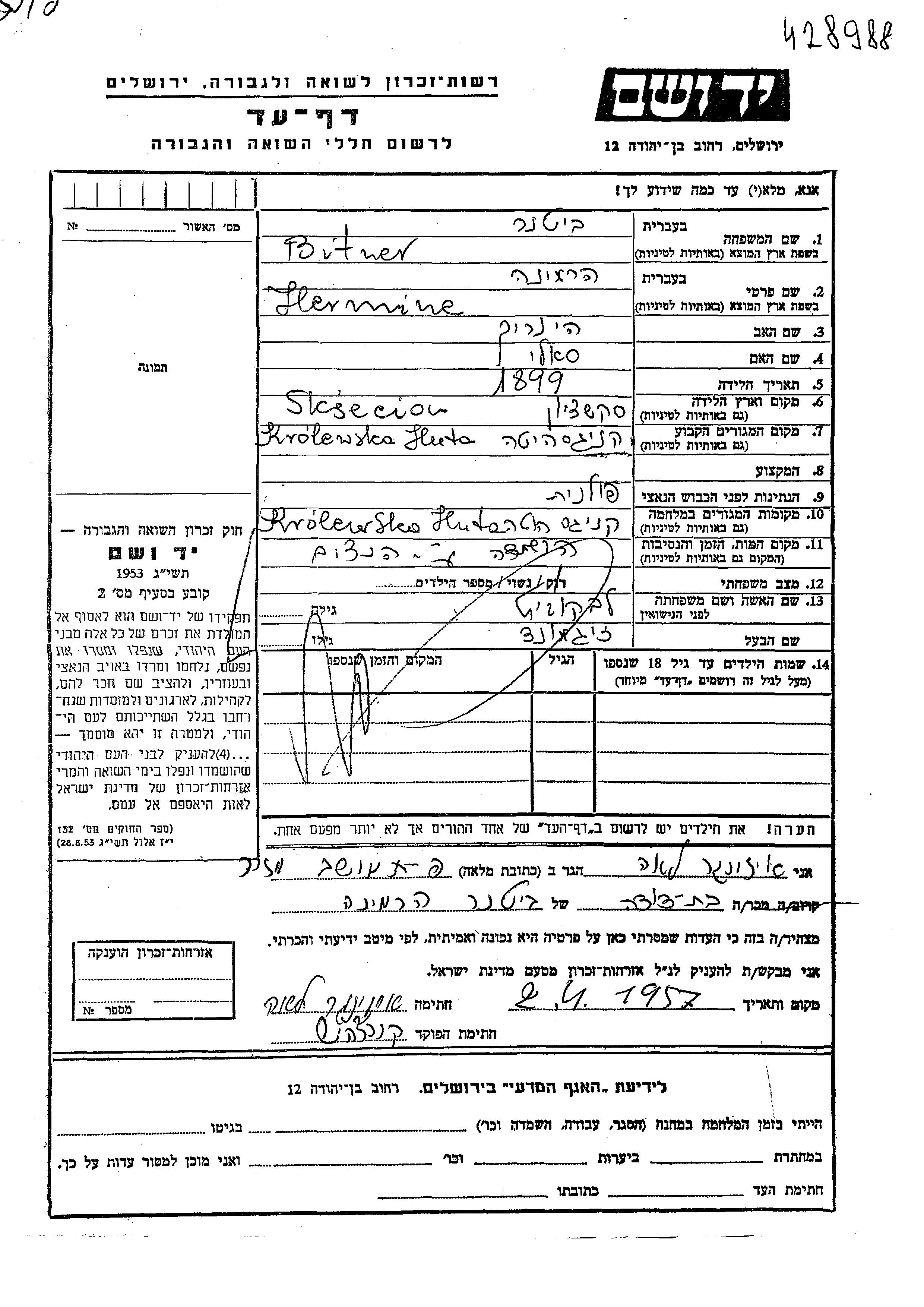 Bitner Hermine 1899 Krolewska Huta, Polonia Hoja de Testimonio