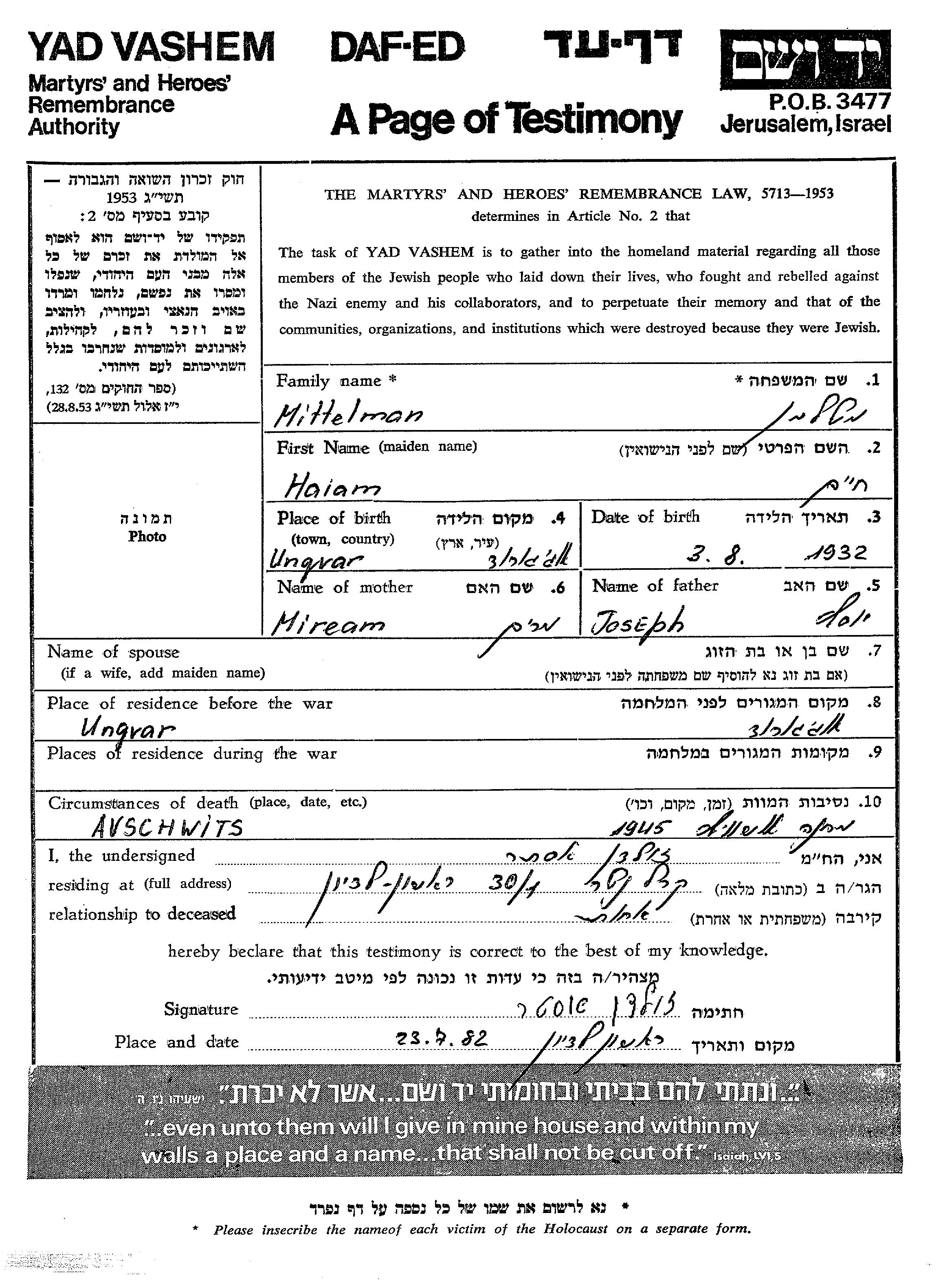 Mittelman Haiam Khaim 1932 Ungvar, Checoslovaquia Hoja de Testimonio