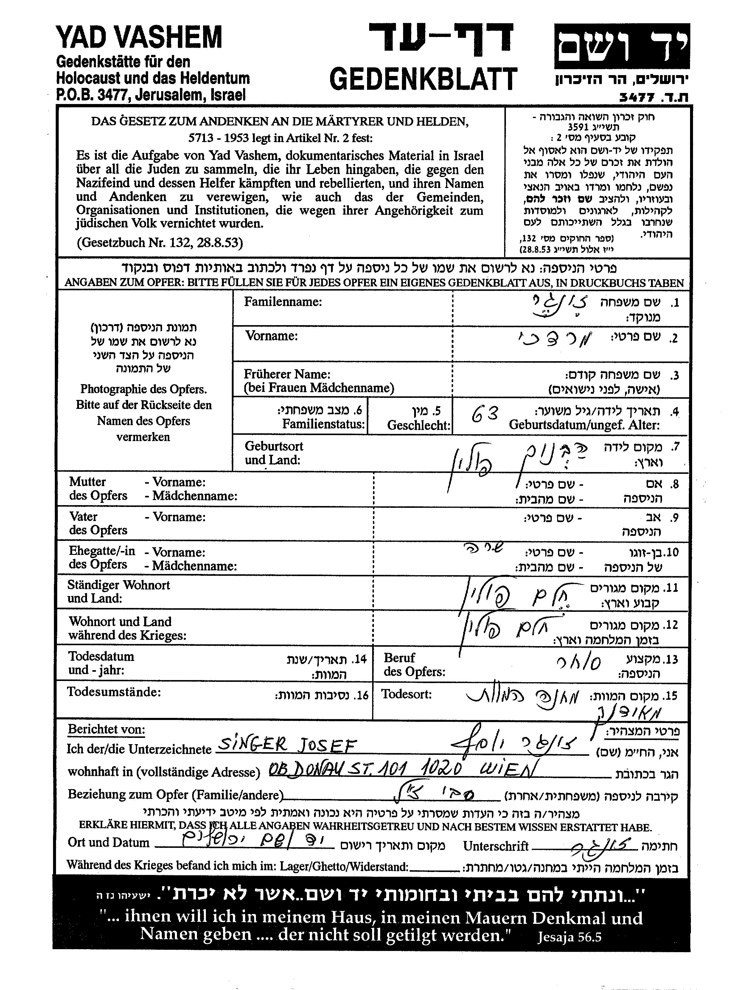 Zinger Mordekhai Chelm, Polonia Hoja de Testimonio