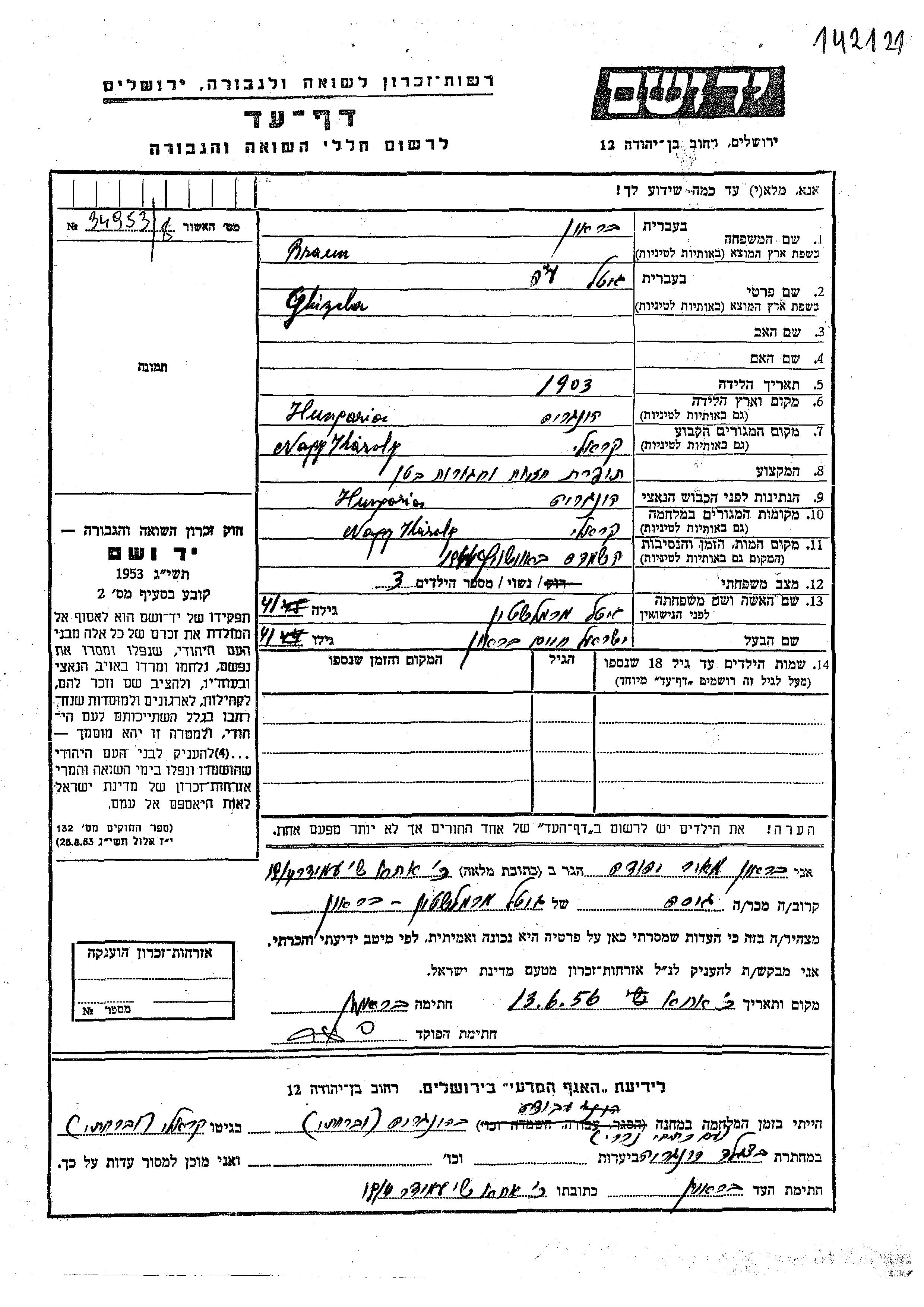 Braun Ghizela Gitel 1903 Nagy Karoly, Rumania Hoja de Testimonio