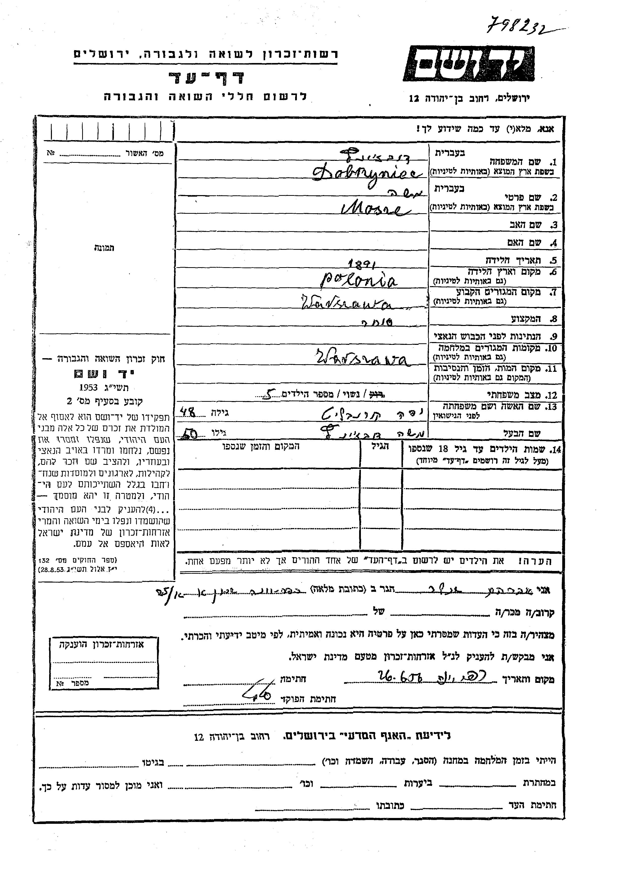 Mosze Dobrzyniec nació en Polonia en 1891. Era Comereciante y Casado con Yafa apellido de soltera Kornblit. Antes de la segunda guerra mundial vivía en Warszawa, Polonia. Durante la guerra estuvo en Warszawa, Polonia.