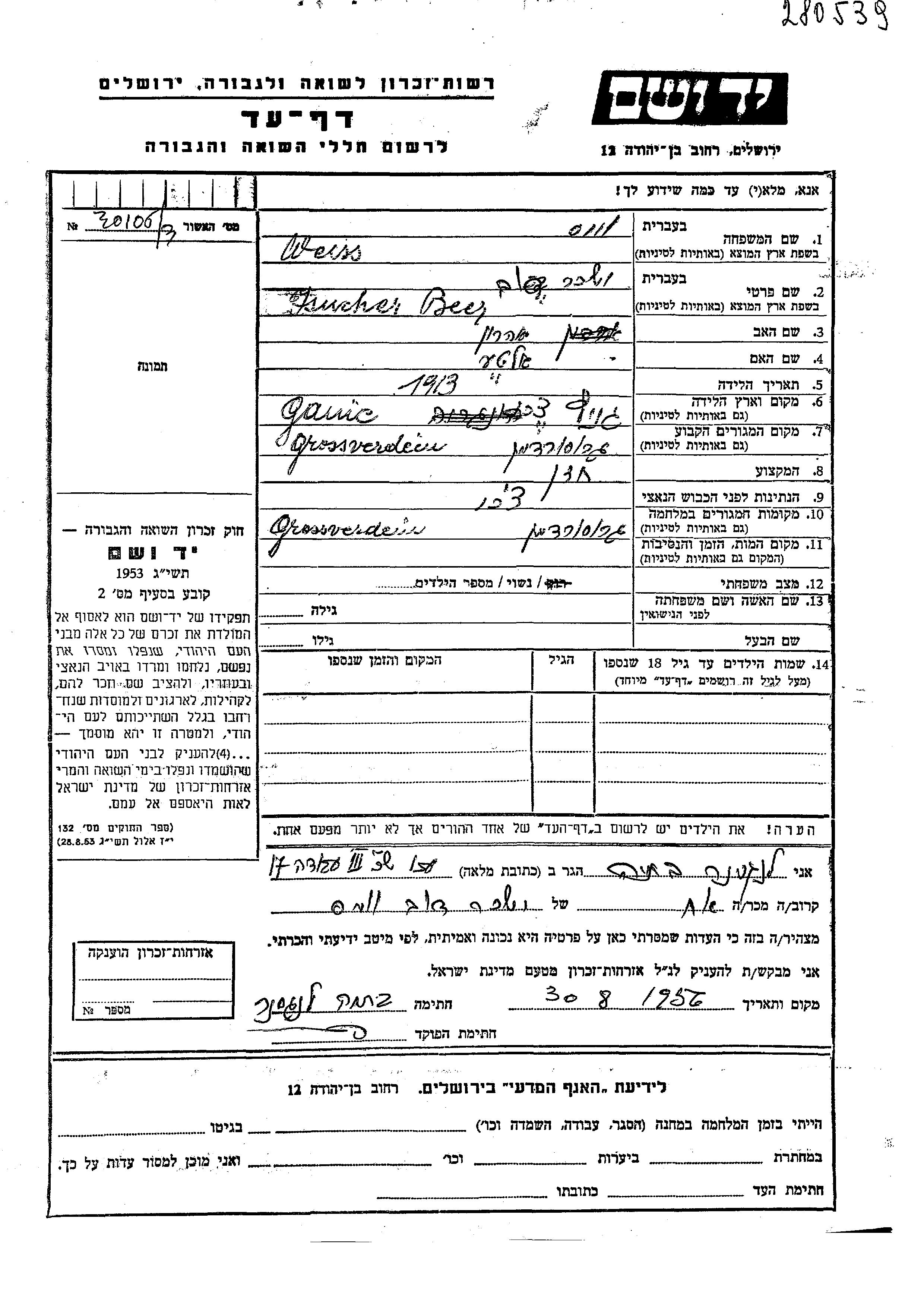 Isucher Beer Dov Weis nació en Ganice, Checoslovaquia en 1913, hijo de Aharon y Alte. Era Cantor litúrgico y Casado. Antes de la segunda guerra mundial vivía en Gross Wardein, Rumania. Durante la guerra estuvo en Gross Wardein, Rumania.