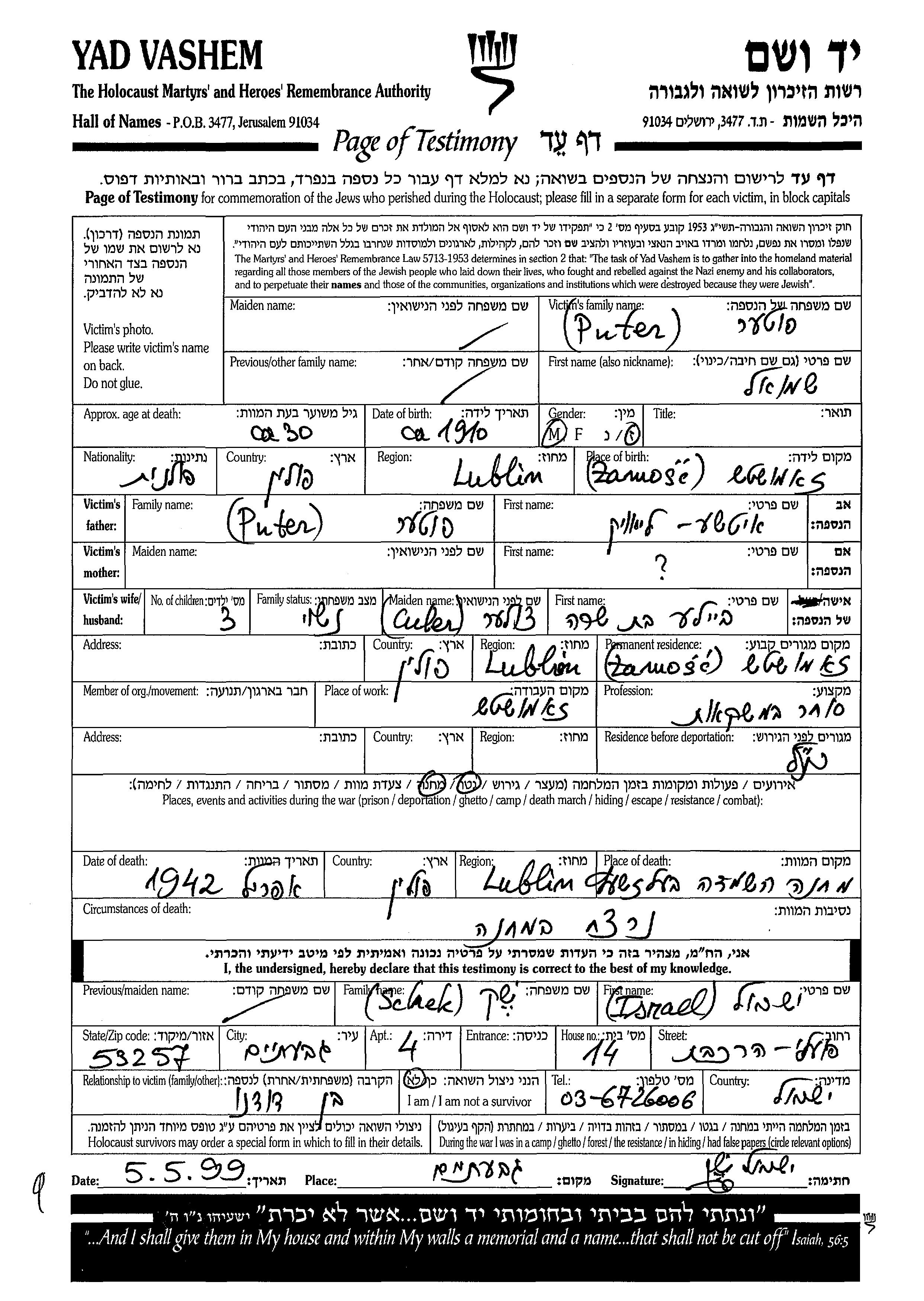 Puter Futer Shmuel 1910 Zamosc, Polonia Hoja de Testimonio