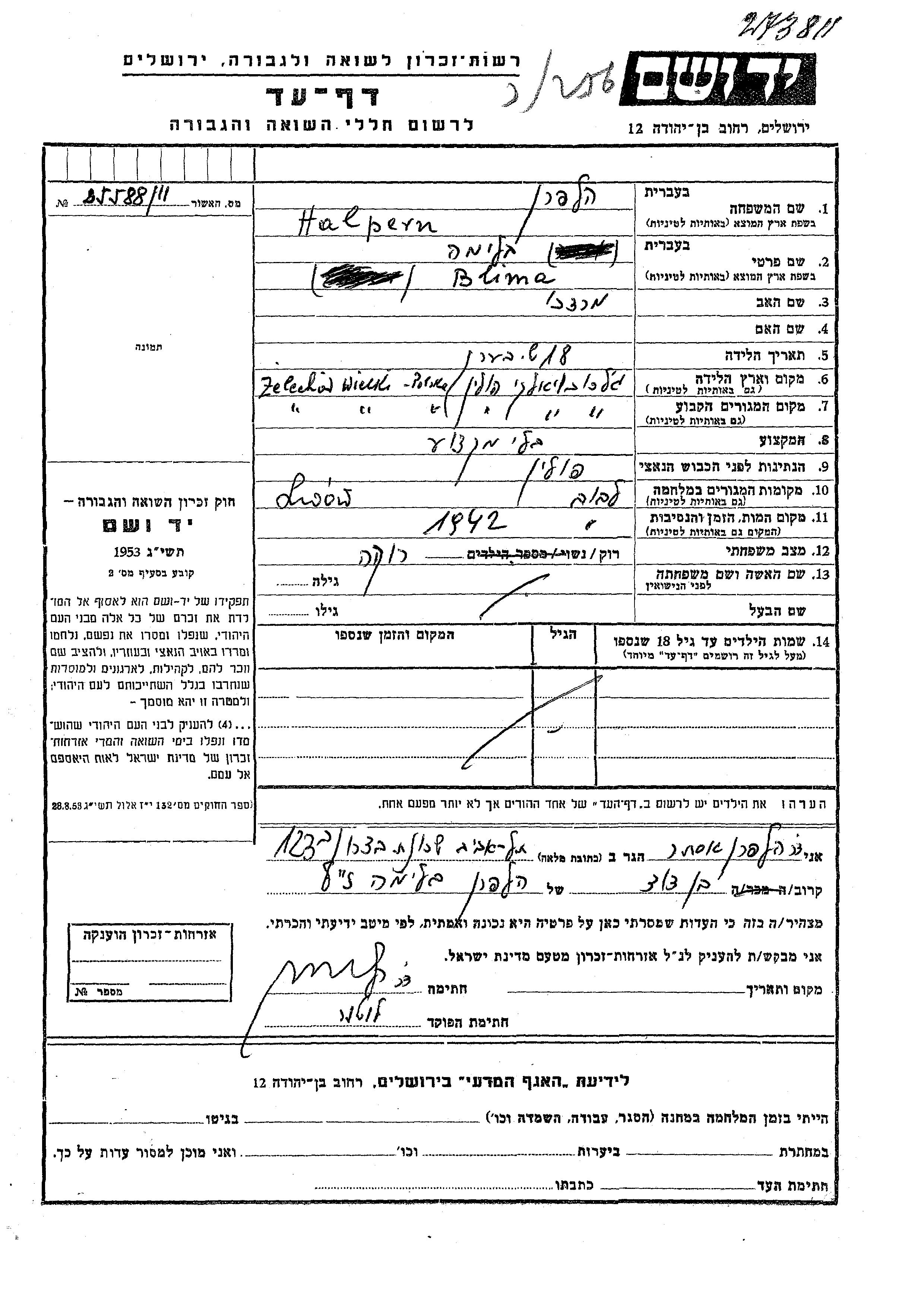 Halpern Blima Zelechow, Polonia Hoja de Testimonio