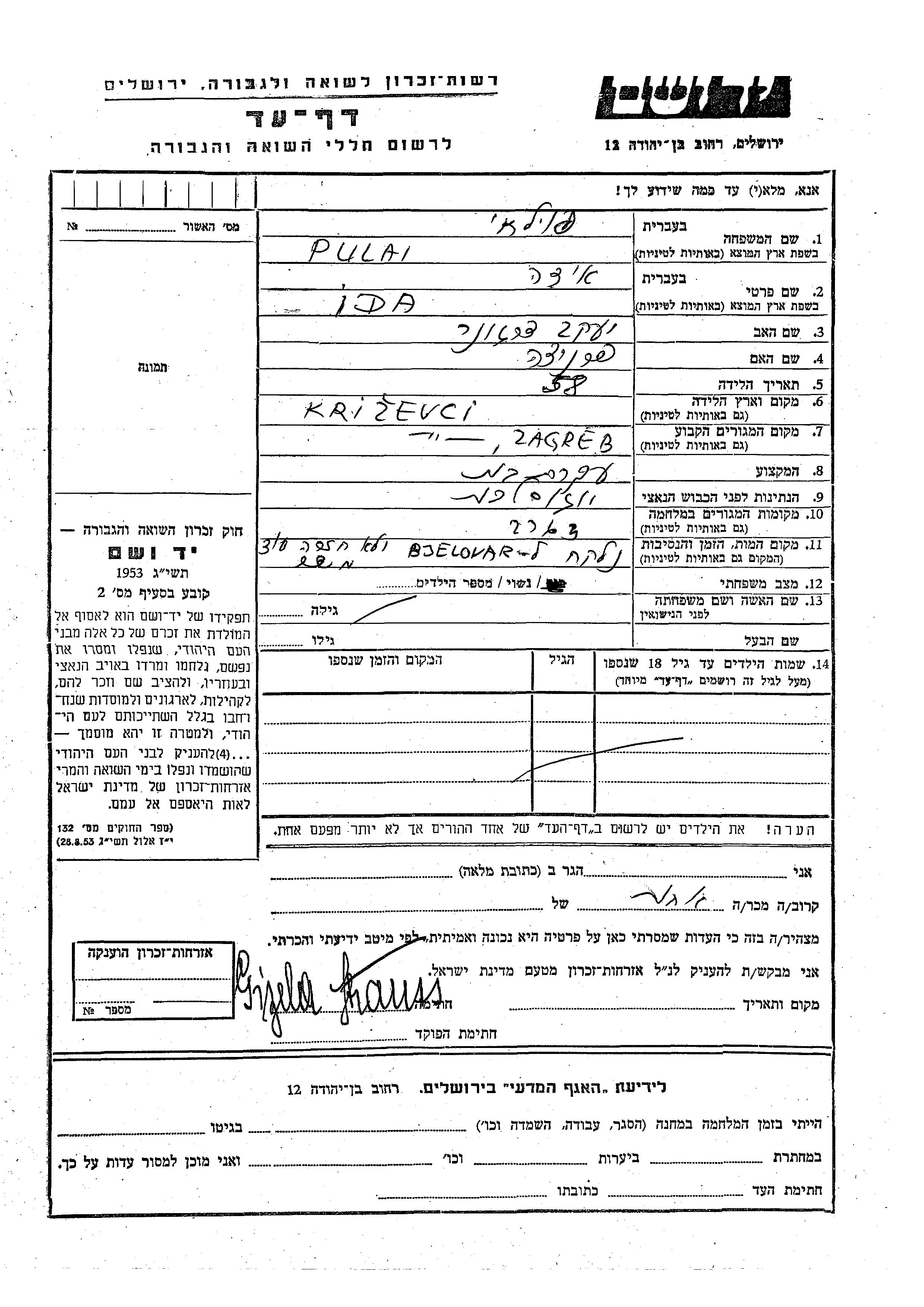 Pulai Ida Zagreb, Yugoslavia Hoja de Testimonio