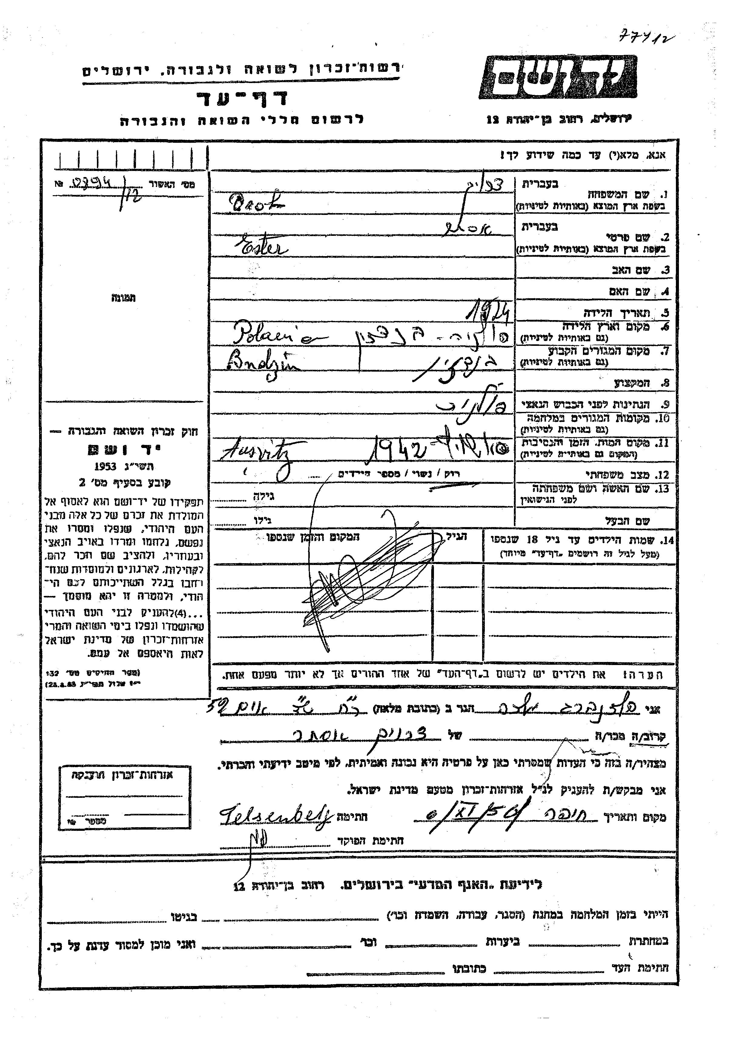 Droh Ester 1924 Bendzin, Polonia Hoja de Testimonio