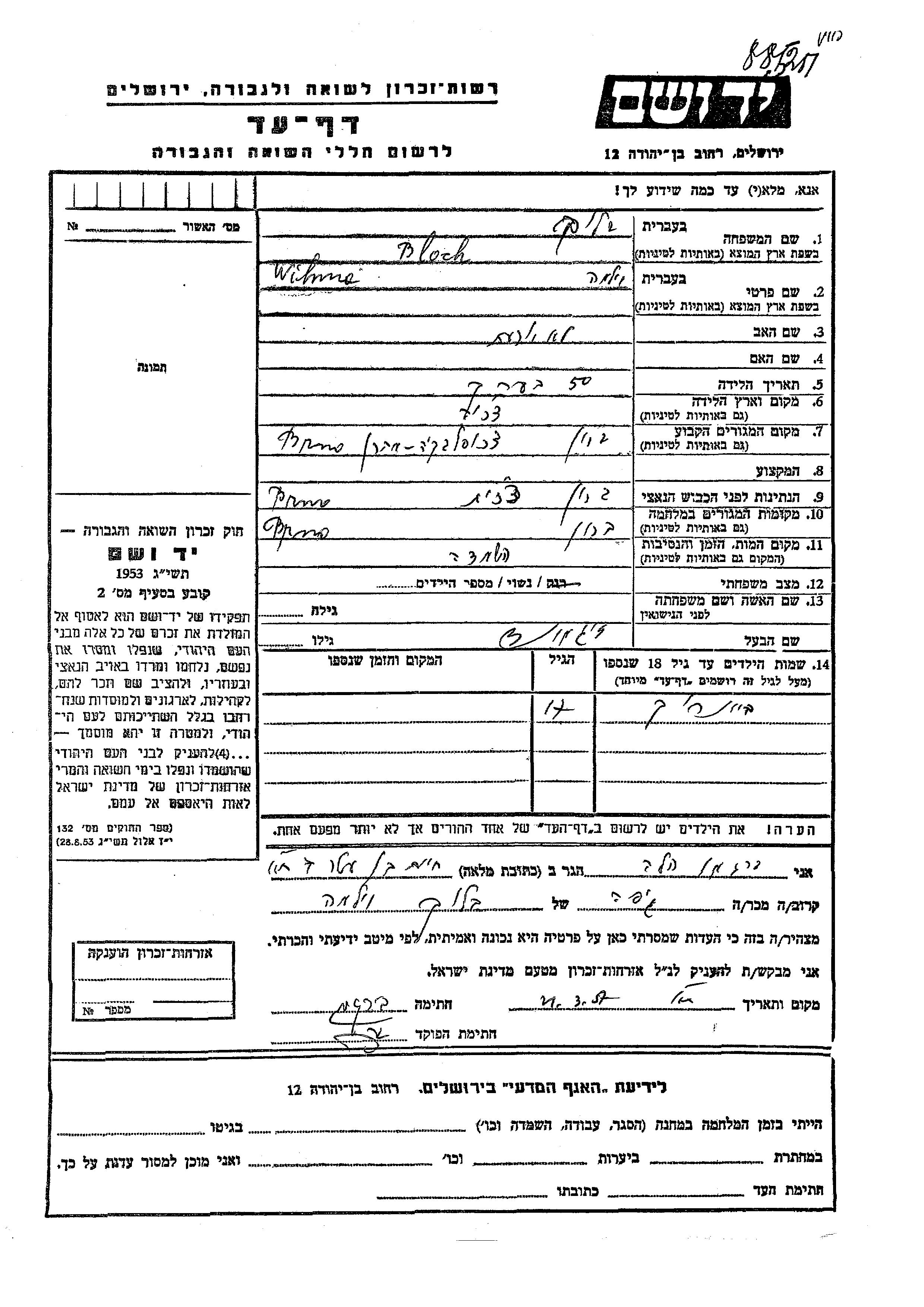 Bloch Wilma Brno, Checoslovaquia Hoja de Testimonio