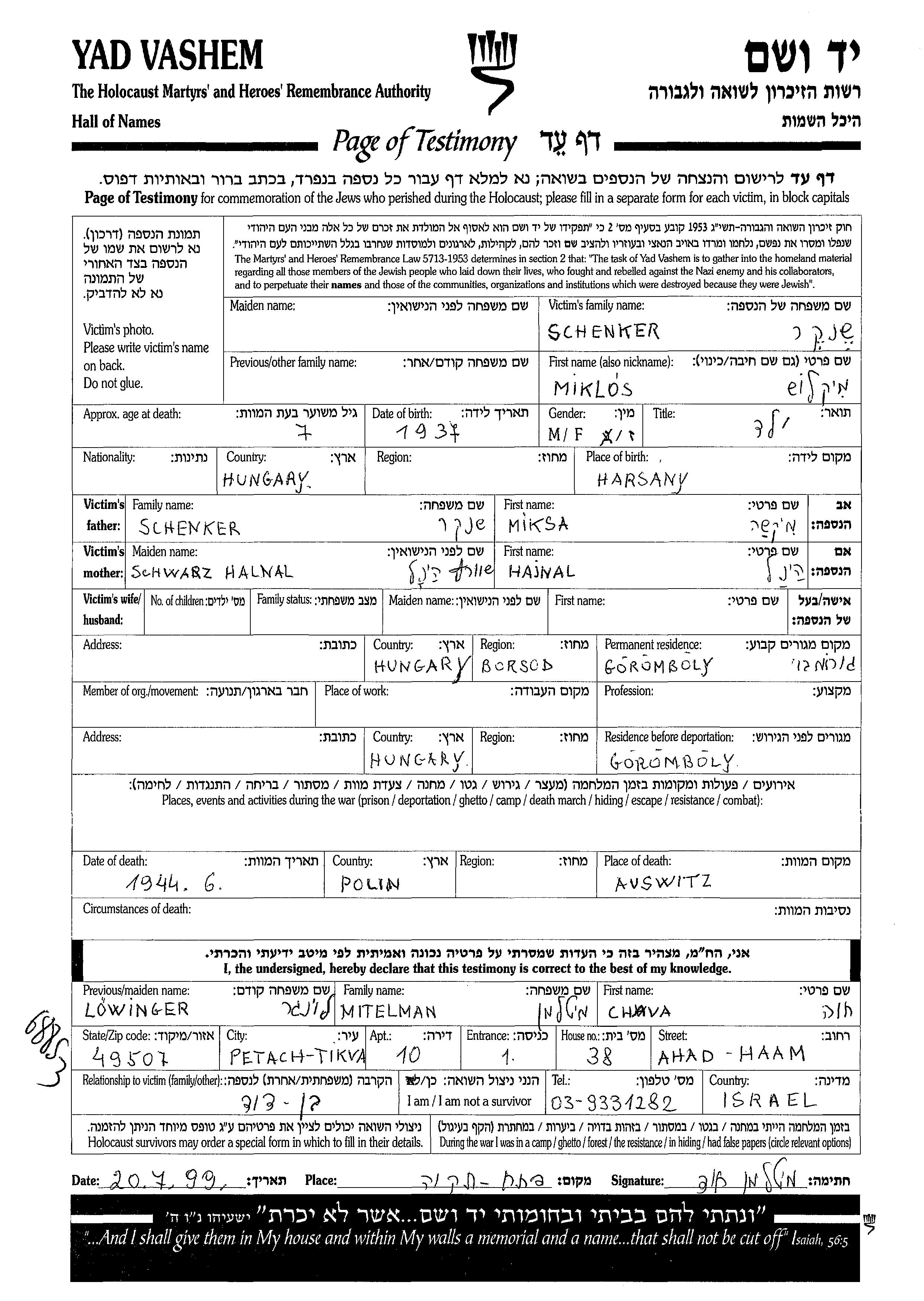 Schenker Miklos 1937 Goromboly, Hungría Hoja de Testimonio