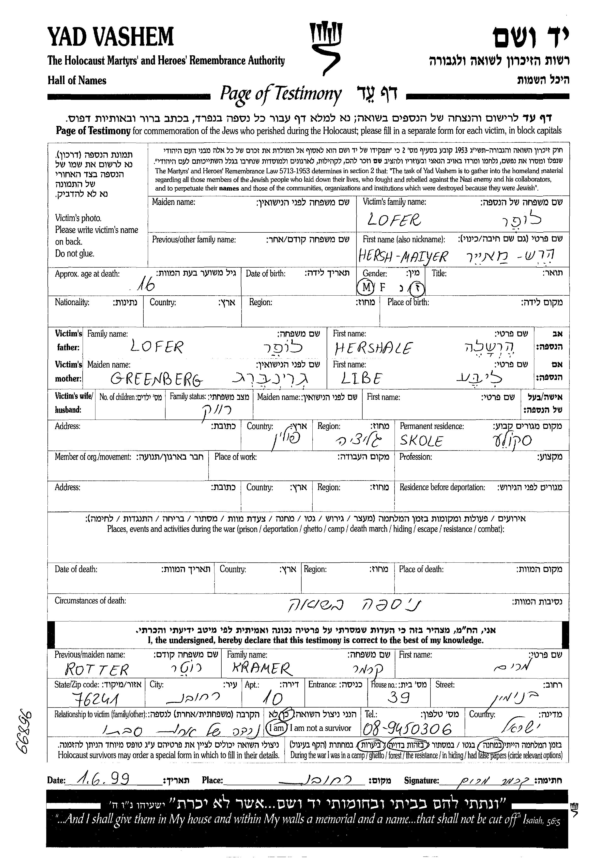 Lofer Hersh Maiyer Skole, Polonia Hoja de Testimonio