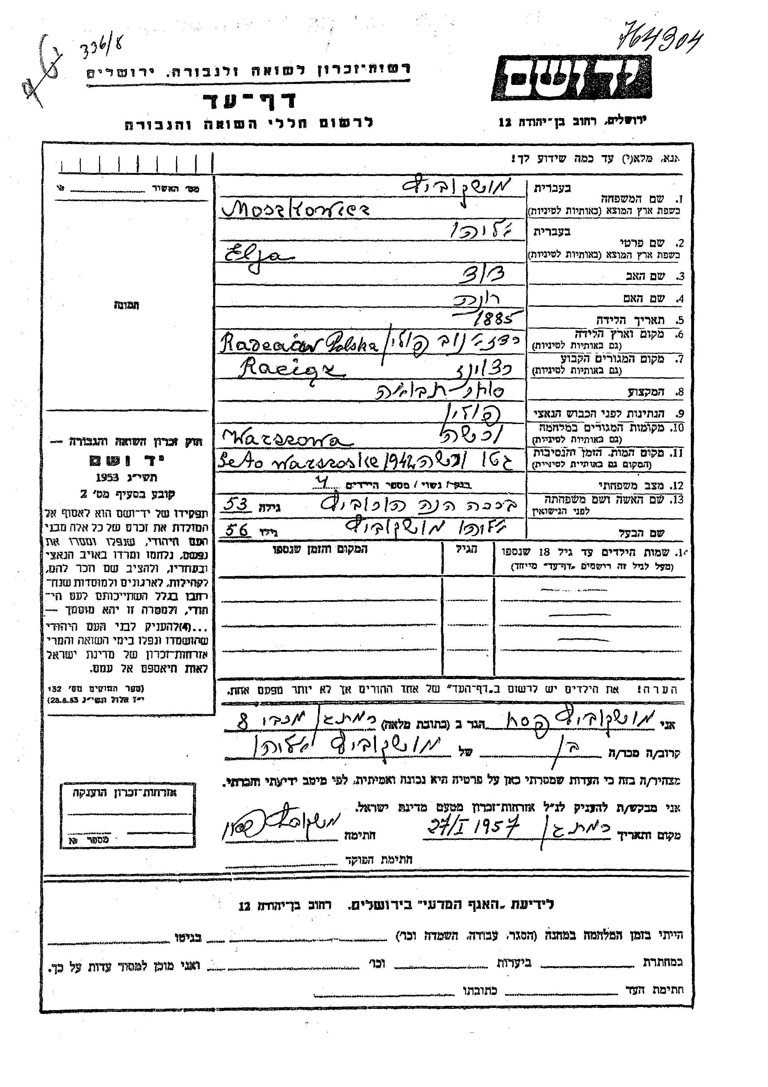Elja Moszkowicz nació en Radzanov, Polonia en 1885, hijo de David y Khana. Era Comerciante de granos y Casado con Brakha Hena apellido de soltera Horovitz. Antes de la segunda guerra mundial vivía en Raciaz, Polonia. Durante la guerra estuvo en Warsaw, Polonia.